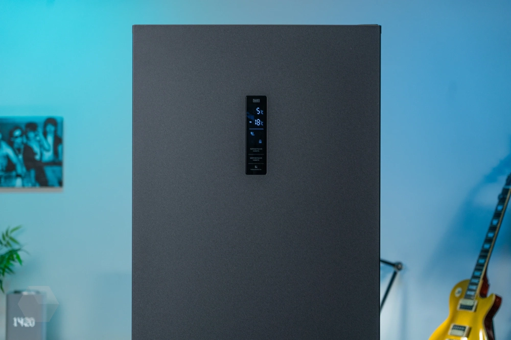 Для управления холодильником по центру верхней двери находится чёрный LED-дисплей с глянцевым покрытием. Он показывает температуру внутри каждой из камер.