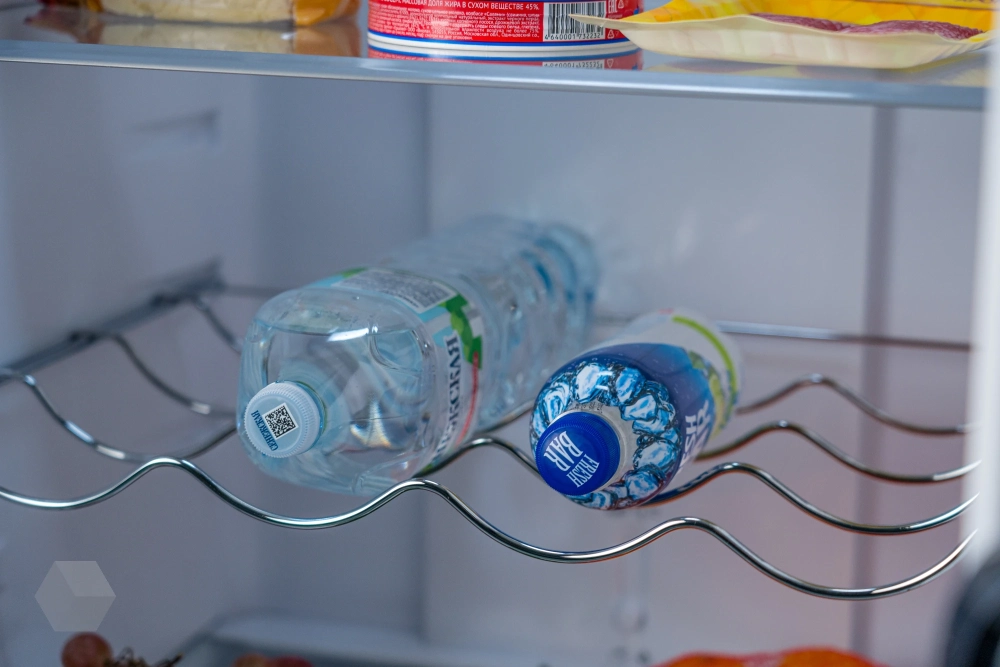 Отдельно обращает на себя внимание ещё одна специальная полка для бутылок, выполненная из металла. Это настоящий мастхев для хранения определённого запаса алкоголя, которого хватит на месяц, неделю или пару выходных дней — в зависимости от меры потребления, конечно. Или минералки с газировкой, если вы за ЗОЖ.