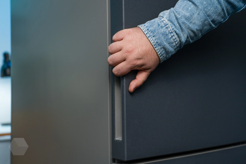 У холодильника нет никаких выступающих частей, то есть даже ручки здесь скрытые. Это не только удобно и практично, но и придаёт лаконичности внешнему виду.