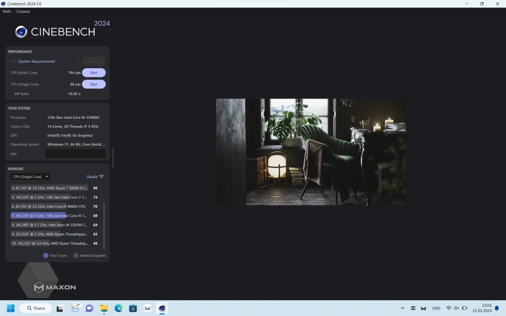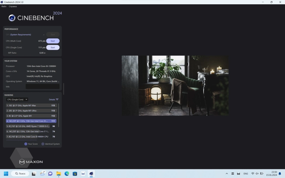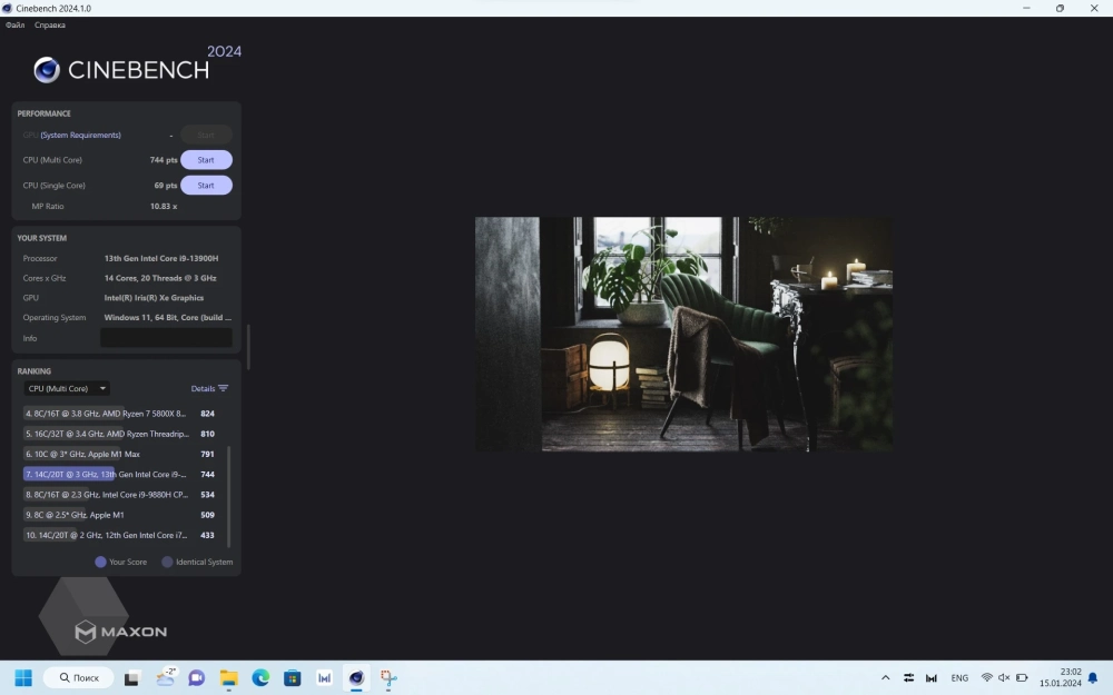 И раз уж у нас ноутбук 2024 года, почему бы не протестировать в более свежей версии Cinebench 2024» Методика бенчмарка отличается от R23, поэтому и цифры здесь иные. В сбалансированном режиме Single Core всего лишь 69 pts, а в Multi core — 744 pts. В производительном показатели для Single Core ожидаемо выше, 111 pts, вот Multi core результатом в 673 pts несколько удивил — получилось меньше, чем в сбалансированном. Возможно, при тестировании пошло что-то не так или просто Cinebench 2024 нуждается в корректировке методики подсчета баллов.