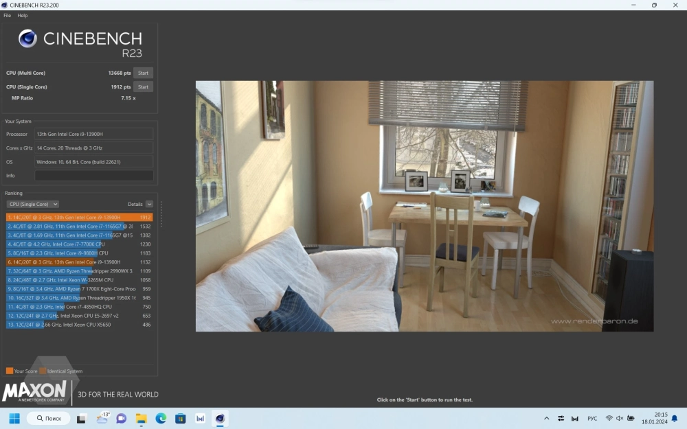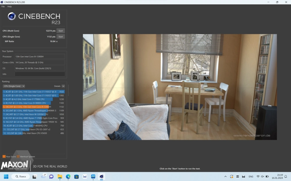 Начнём с Cinebench R23. В сбалансированном режиме результат Single Core — 1132 pts, а в Multi core — 12 274 pts. В производительном показатели значительно выше: Single Core — 1912 pts, Multi core — 13 668 pts.