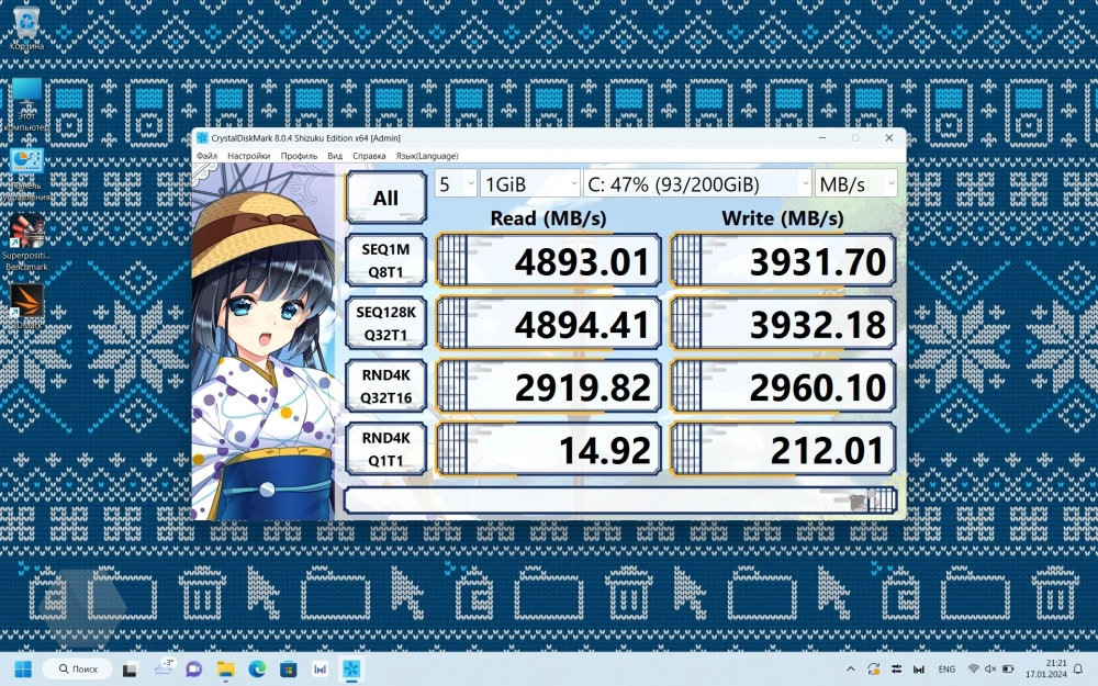 Скорость последовательного чтения SSD-накопителя получилась до 4711 МБ/с, а записи — до 3794. Рандомные чтение и запись ожидаемо меньше: до 45 и 151 МБ/с, соответственно.