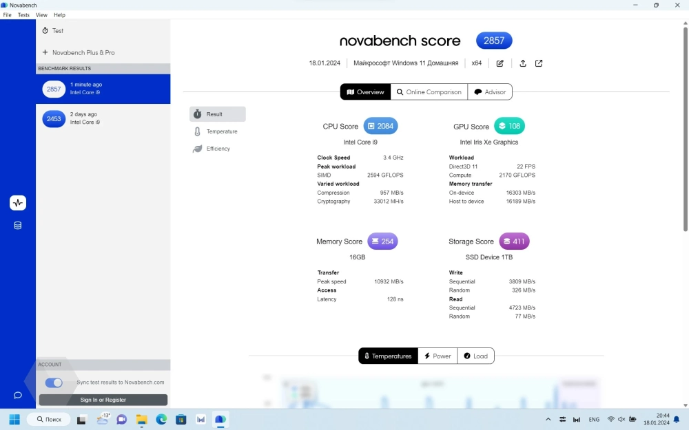 В Novabench работа процессора в сбалансированном режиме была оценена на 2221 Гфлопс, а в производительном — 2594. Но в показателях этого теста остановимся чуть подробнее, потому что он проверяет показатели не только CPU, но и остальных комплектующих системы.