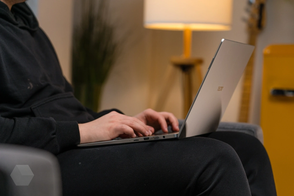 Цветовой охват экрана — 100% sRGB, присутствует сертификат TÜV Eye Comfort, который обещает минимальное напряжение для глаз во время длительных сессий за ноутбуком. Широкий угол обзора 178 градусов обеспечивает точную цветопередачу вне зависимости от точки обзора.