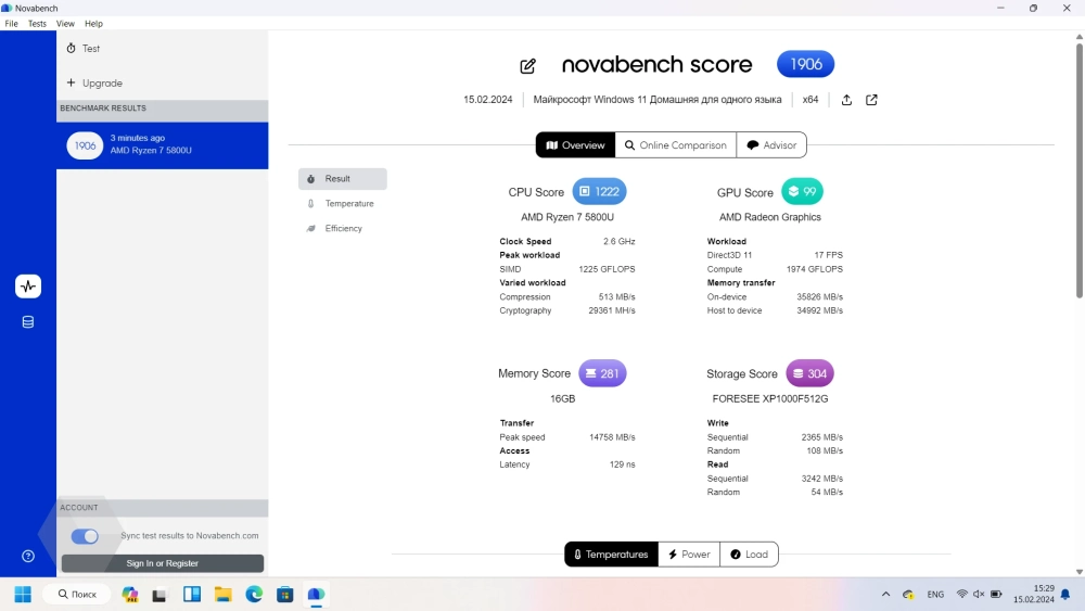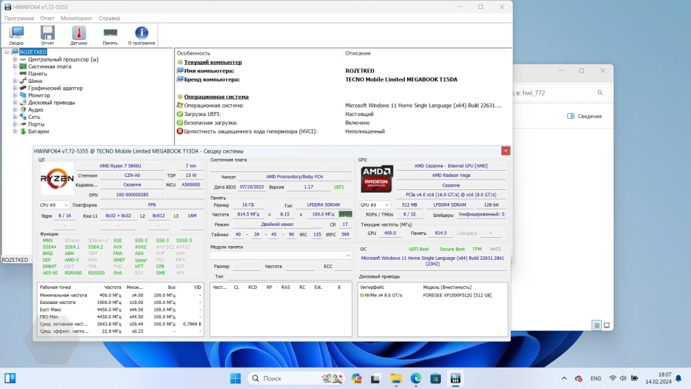 - Процессор: AMD R7-5800U (8 ядер, 16 потоков, частота до 4,4 ГГц)