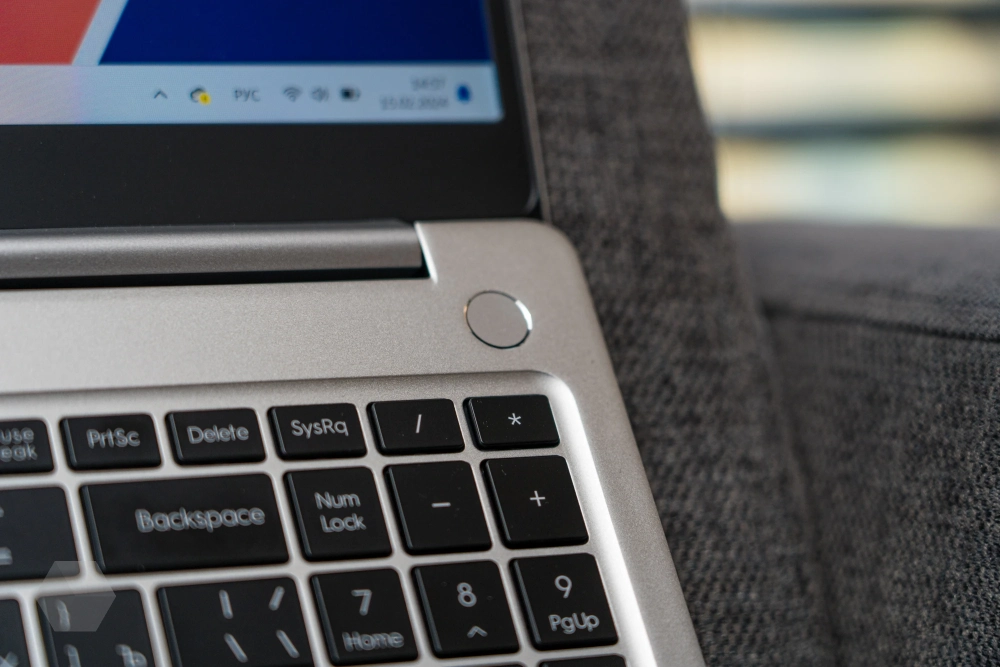 Ноутбук получил полноразмерную клавиатуру с четырехуровневой подсветкой белого цвета и относительно небольшим ходом клавиш. Из общего блока клавиш отдельно вынесена кнопка включения, совмещенная со сканером отпечатков пальцев. Датчик быстро срабатывает, с ним удобно и безопасно.