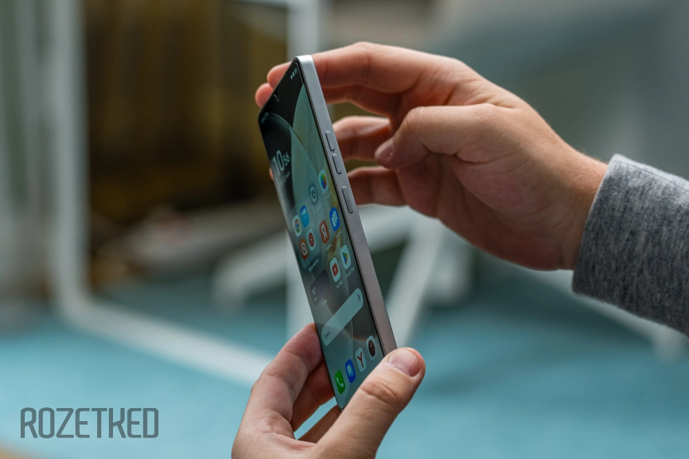 Боковые рамки выполнены из пластика, который очень сильно похож на алюминий. Справа — раздельные кнопки регулировки громкости и питания, сверху — динамик с надписью Dolby Atmos, микрофон и ИК-порт для управления бытовой техникой. Снизу расположился слот для SIM-карты, микрофон, динамик и USB-C.