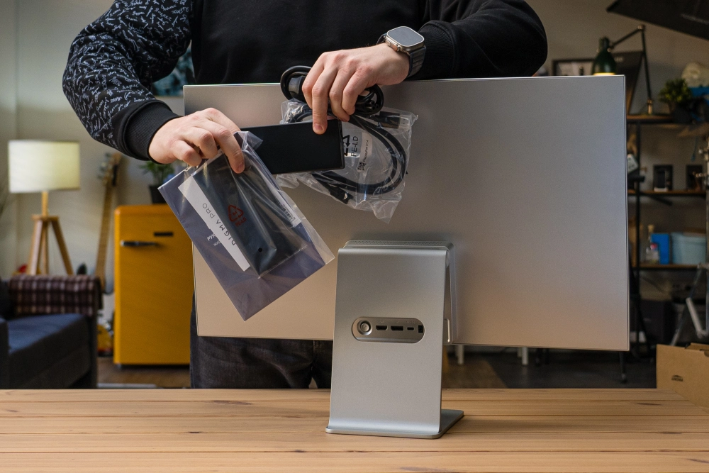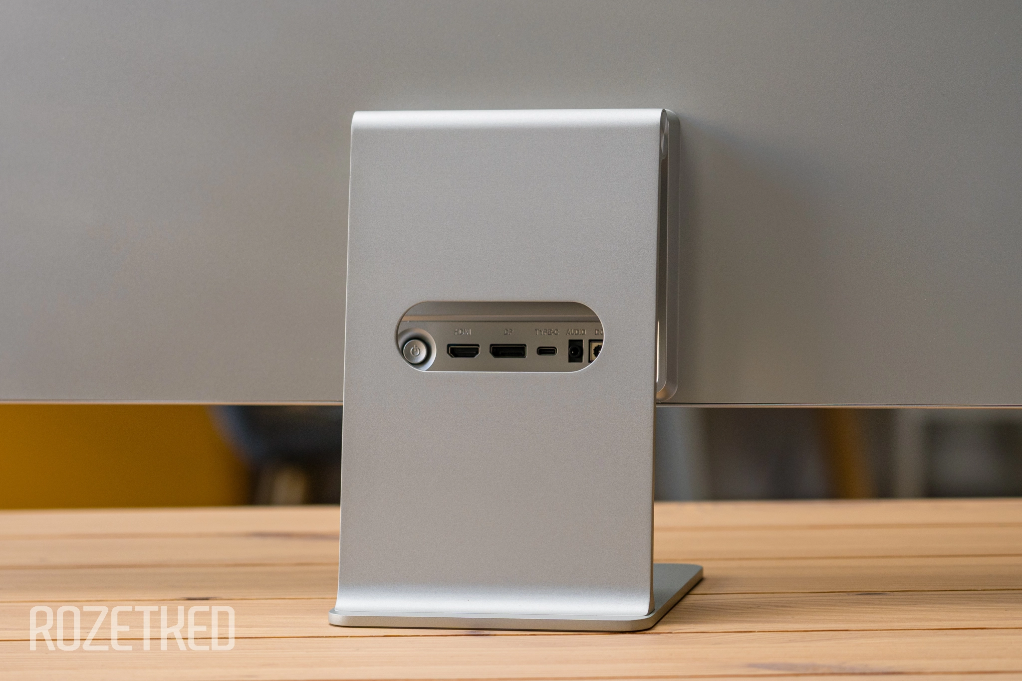 Разъёмы расположены неудачно, на мой взгляд. Порты находятся за центральной стойкой, у которой для проводов есть отверстие. В него не всегда удобно просовывать кабели. Было бы лучше поставить разъёмы слева или справа задней панели, как у того же Studio Display.