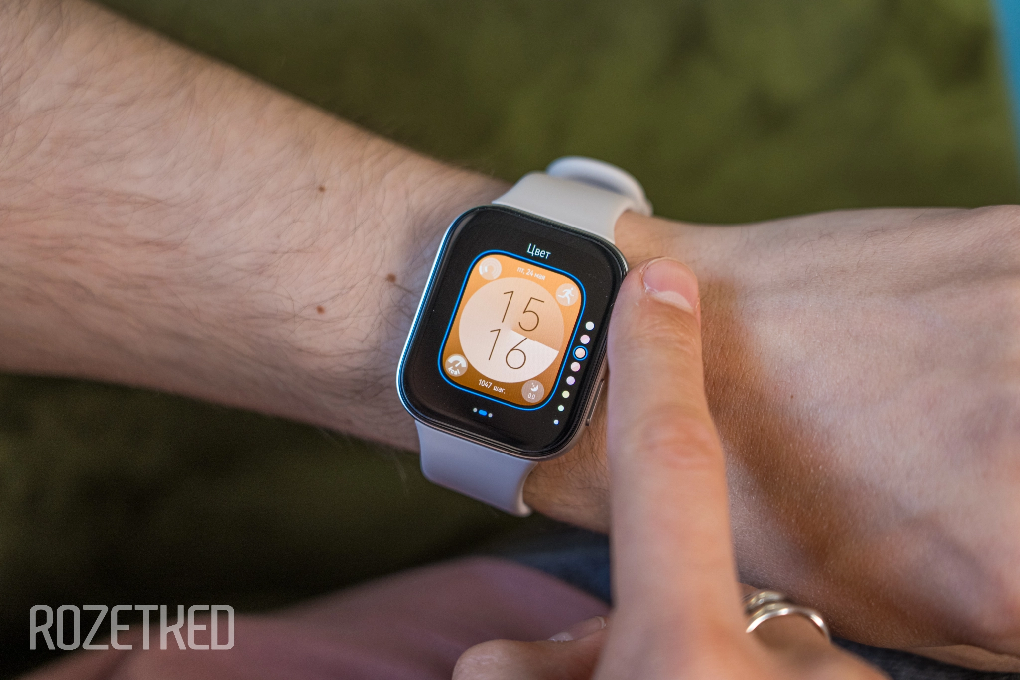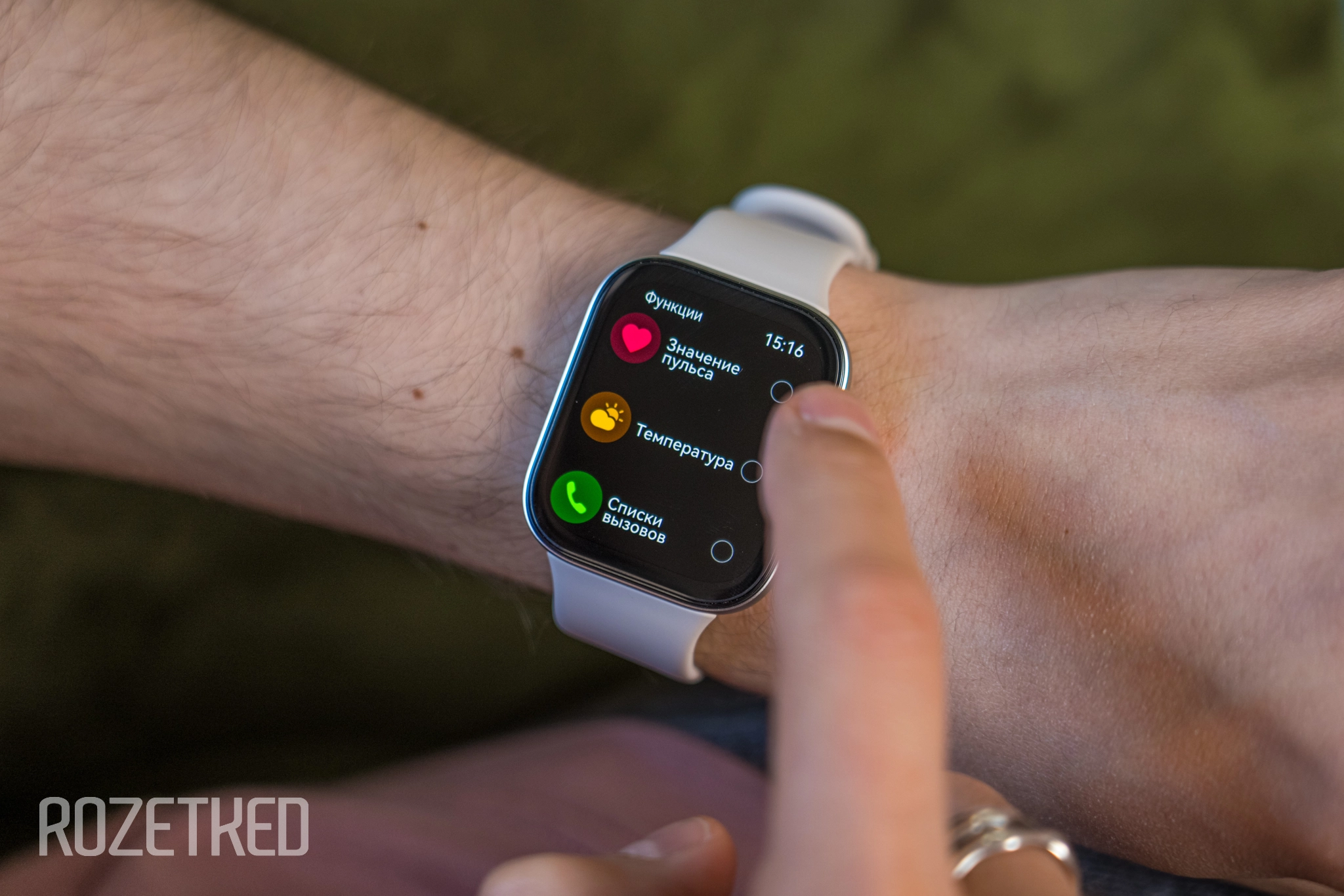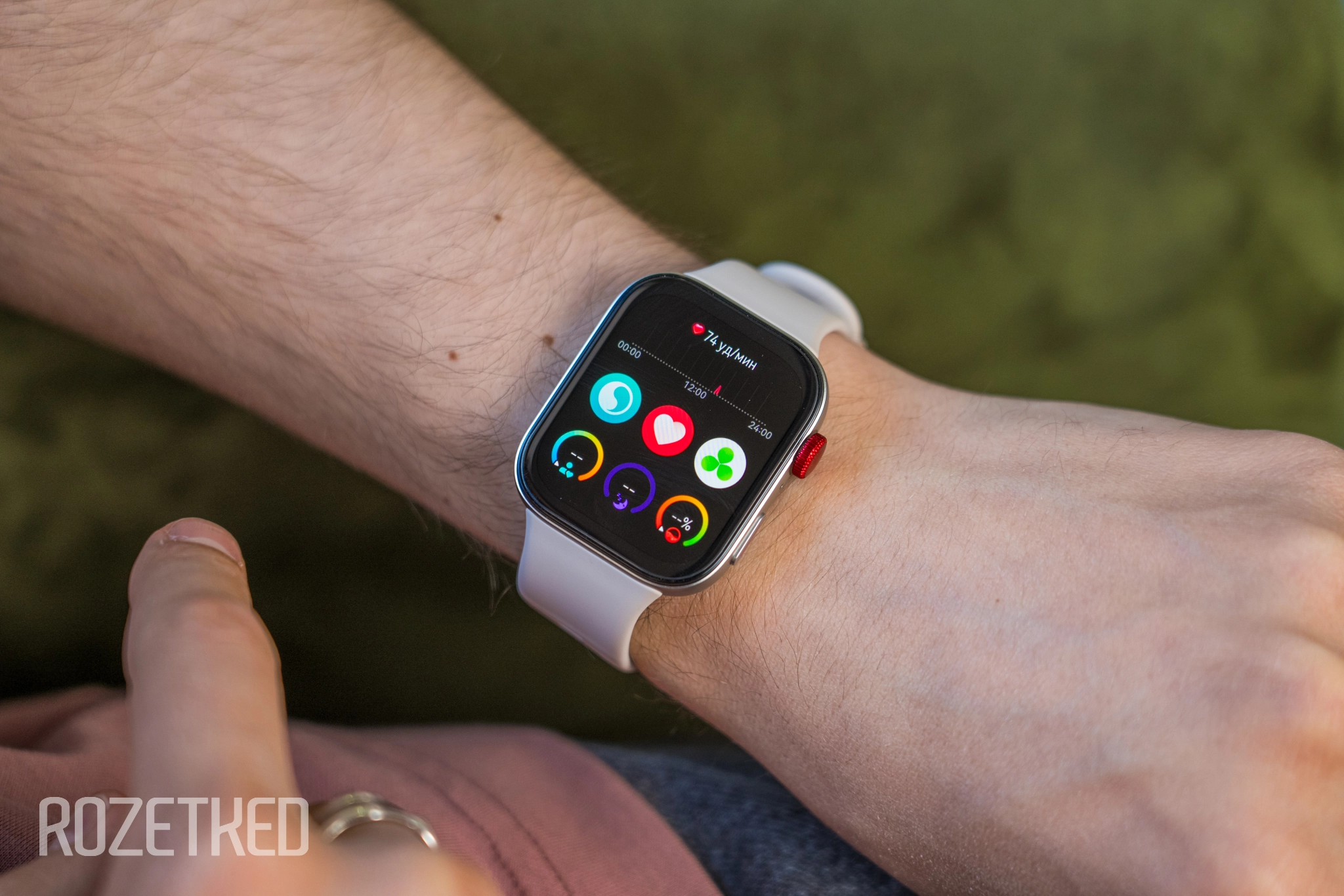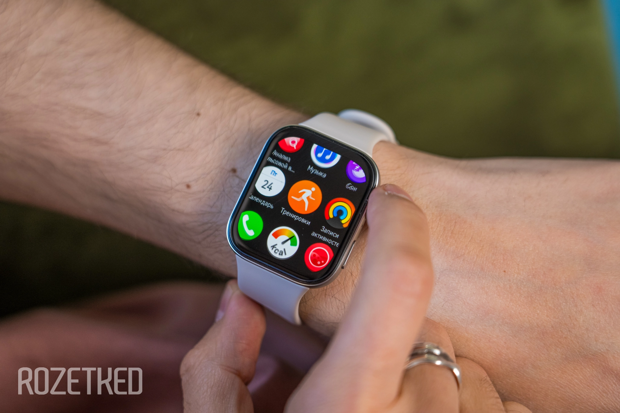 В часах используется качественная матрица OLED размером 1,82 дюйма и разрешением 480×408 пикселей. То есть, не совсем квадратная. Экран прикрыт стеклом с качественным олеофобным покрытием, которое даёт пальцу скользить по стеклу беспрепятственно. Плотность пикселей очень высокая — около 347 точек на дюйм. Экран не только максимально чёткий, с высокой контрастностью и широким цветовым диапазоном шире sRGB, но ещё и очень яркий.