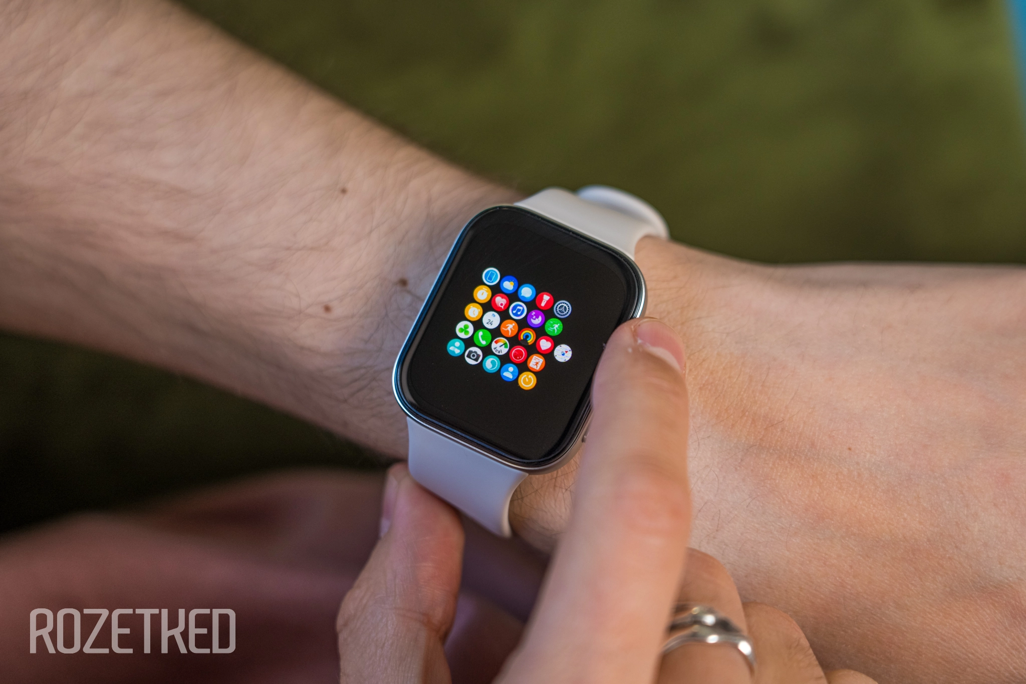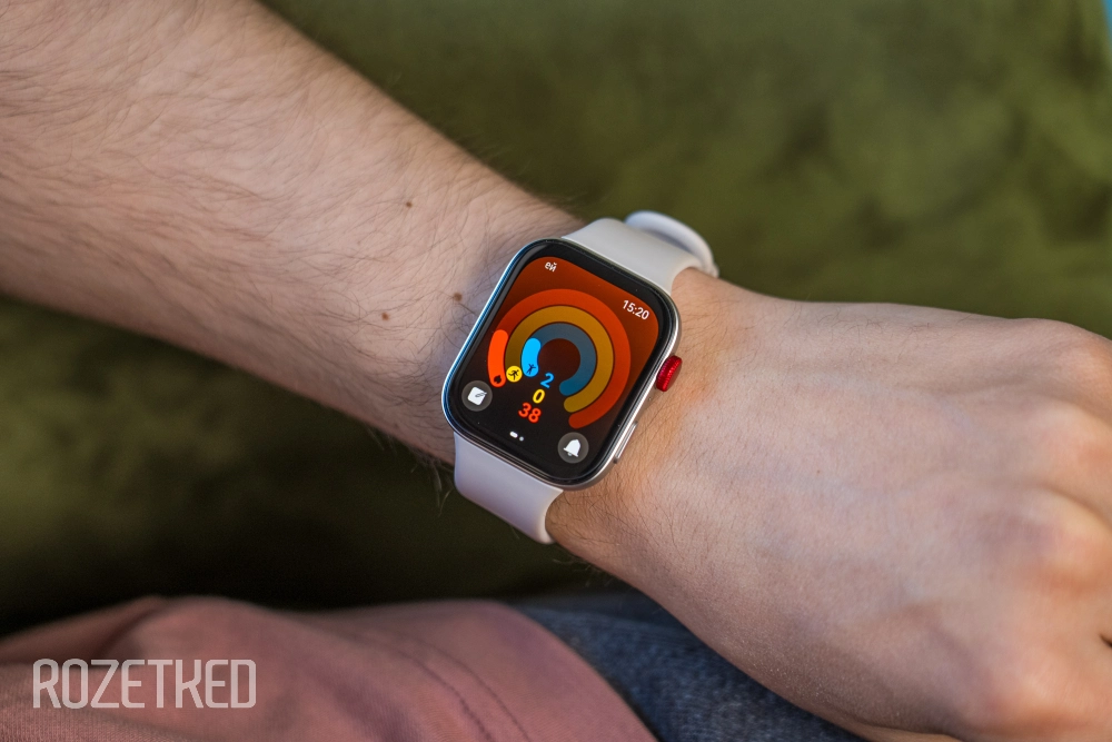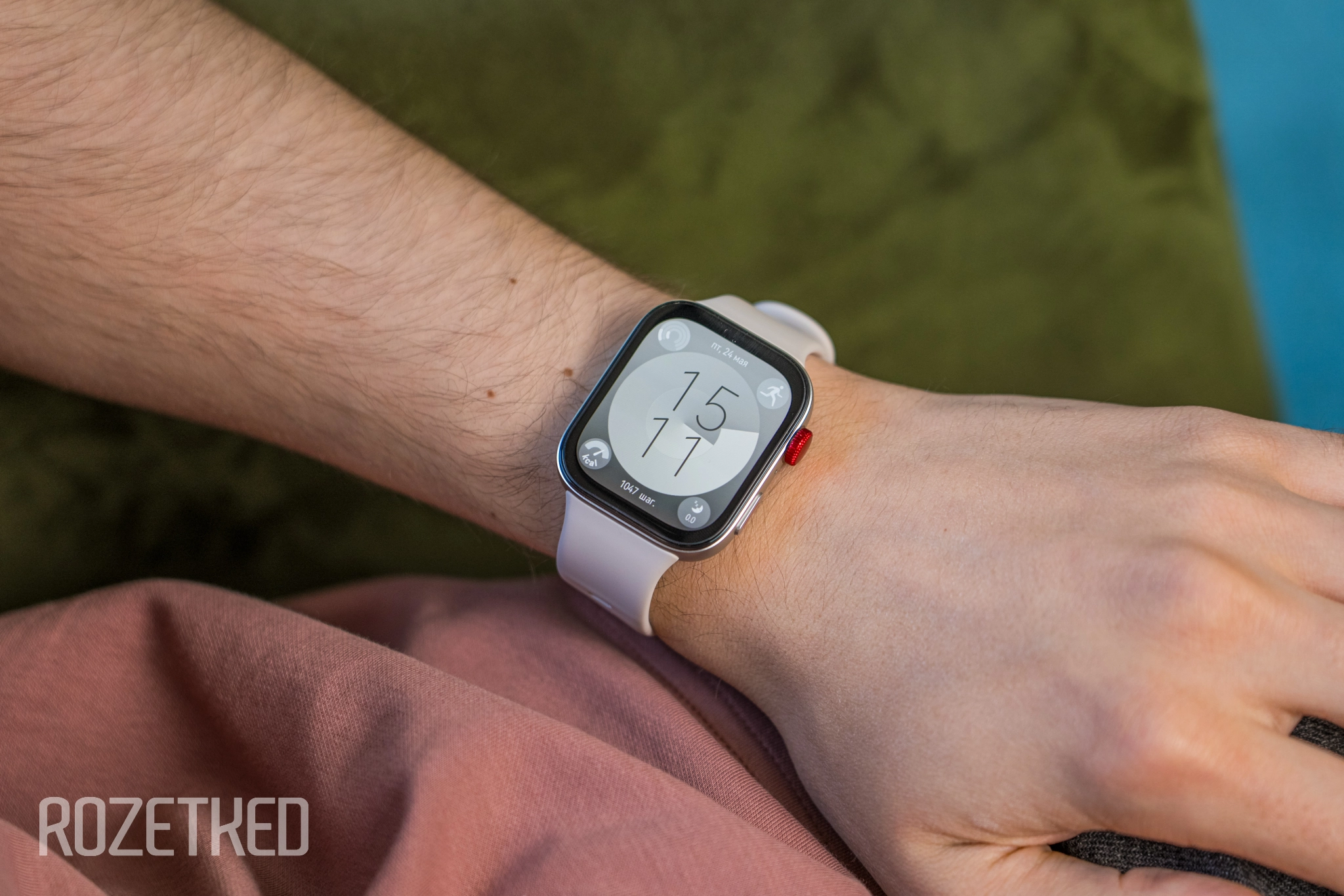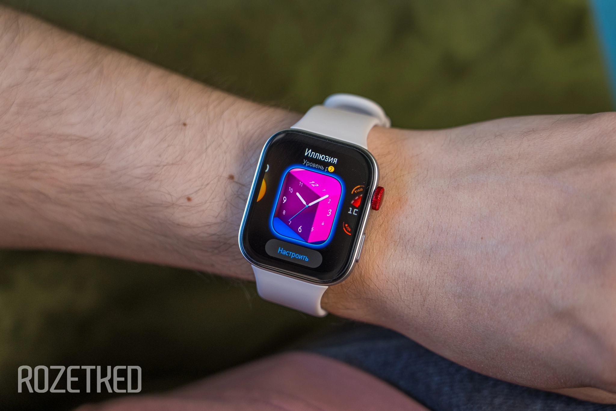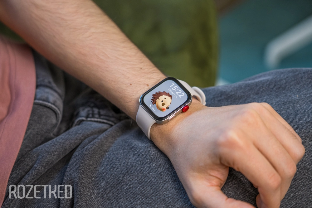 В часах используется качественная матрица OLED размером 1,82 дюйма и разрешением 480×408 пикселей. То есть, не совсем квадратная. Экран прикрыт стеклом с качественным олеофобным покрытием, которое даёт пальцу скользить по стеклу беспрепятственно. Плотность пикселей очень высокая — около 347 точек на дюйм. Экран не только максимально чёткий, с высокой контрастностью и широким цветовым диапазоном шире sRGB, но ещё и очень яркий.