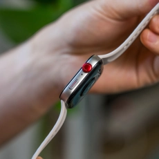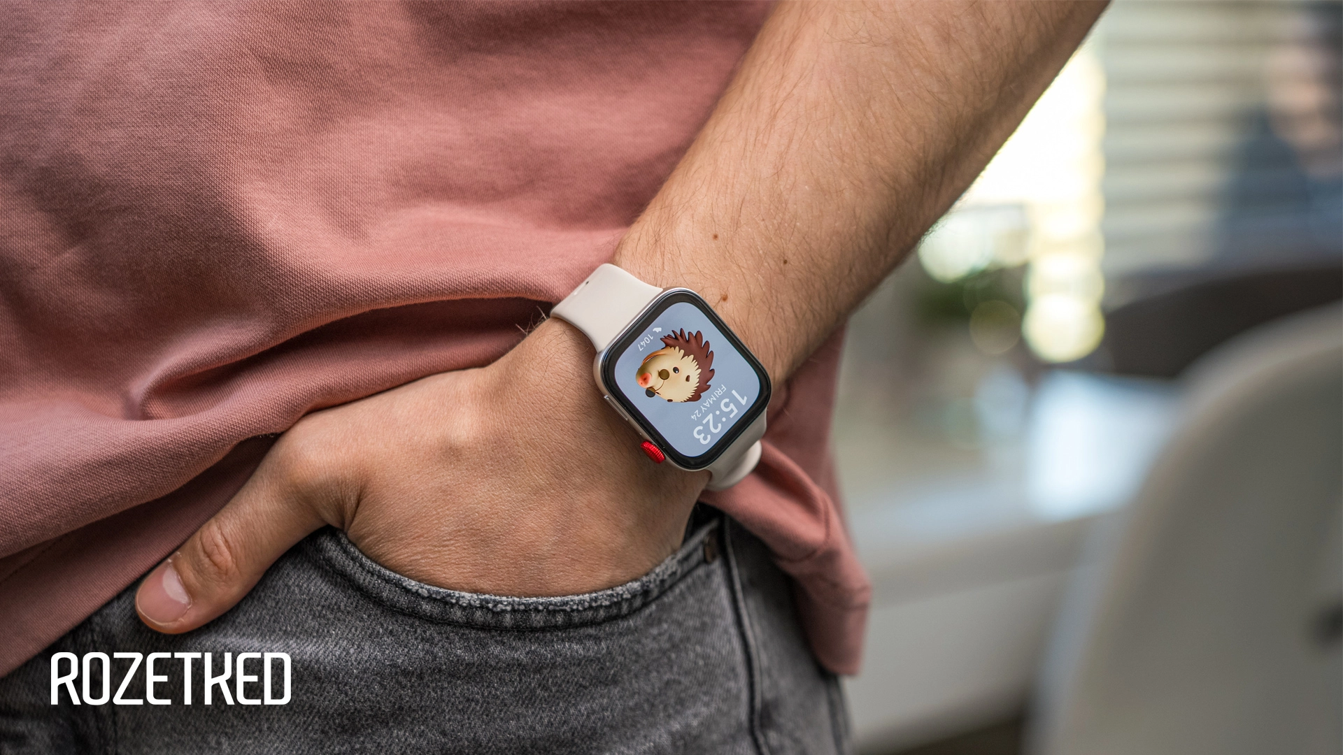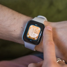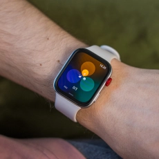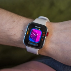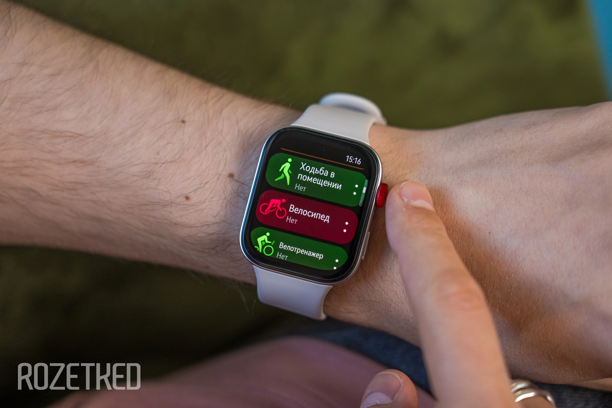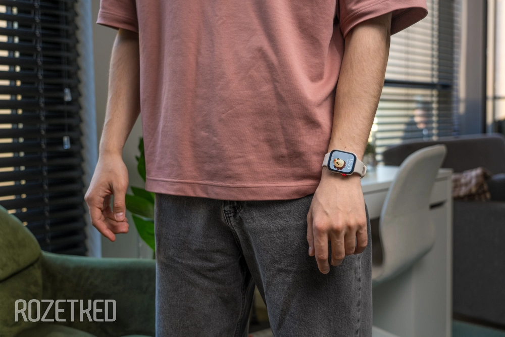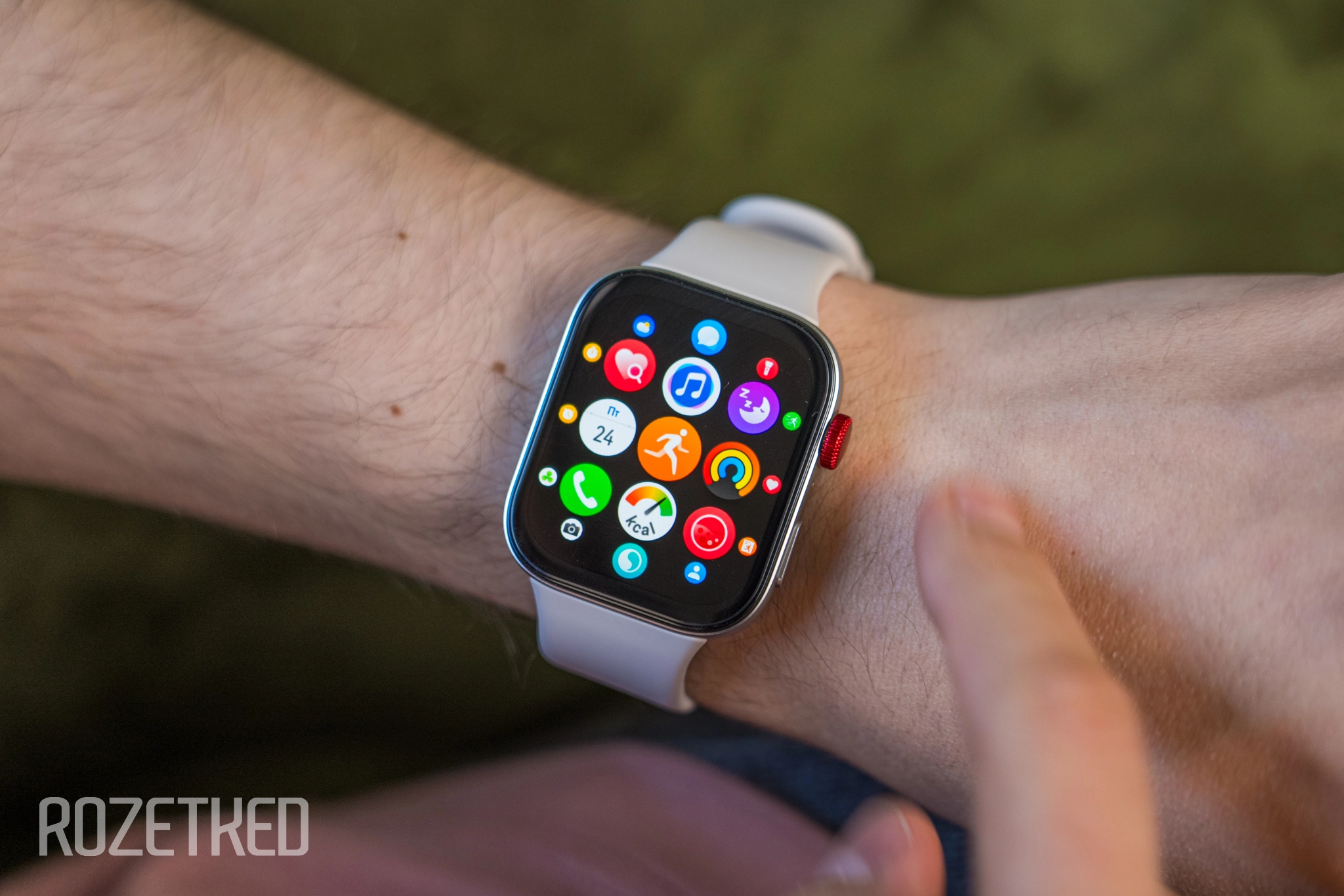 В часах используется качественная матрица OLED размером 1,82 дюйма и разрешением 480×408 пикселей. То есть, не совсем квадратная. Экран прикрыт стеклом с качественным олеофобным покрытием, которое даёт пальцу скользить по стеклу беспрепятственно. Плотность пикселей очень высокая — около 347 точек на дюйм. Экран не только максимально чёткий, с высокой контрастностью и широким цветовым диапазоном шире sRGB, но ещё и очень яркий.