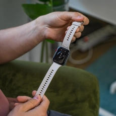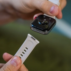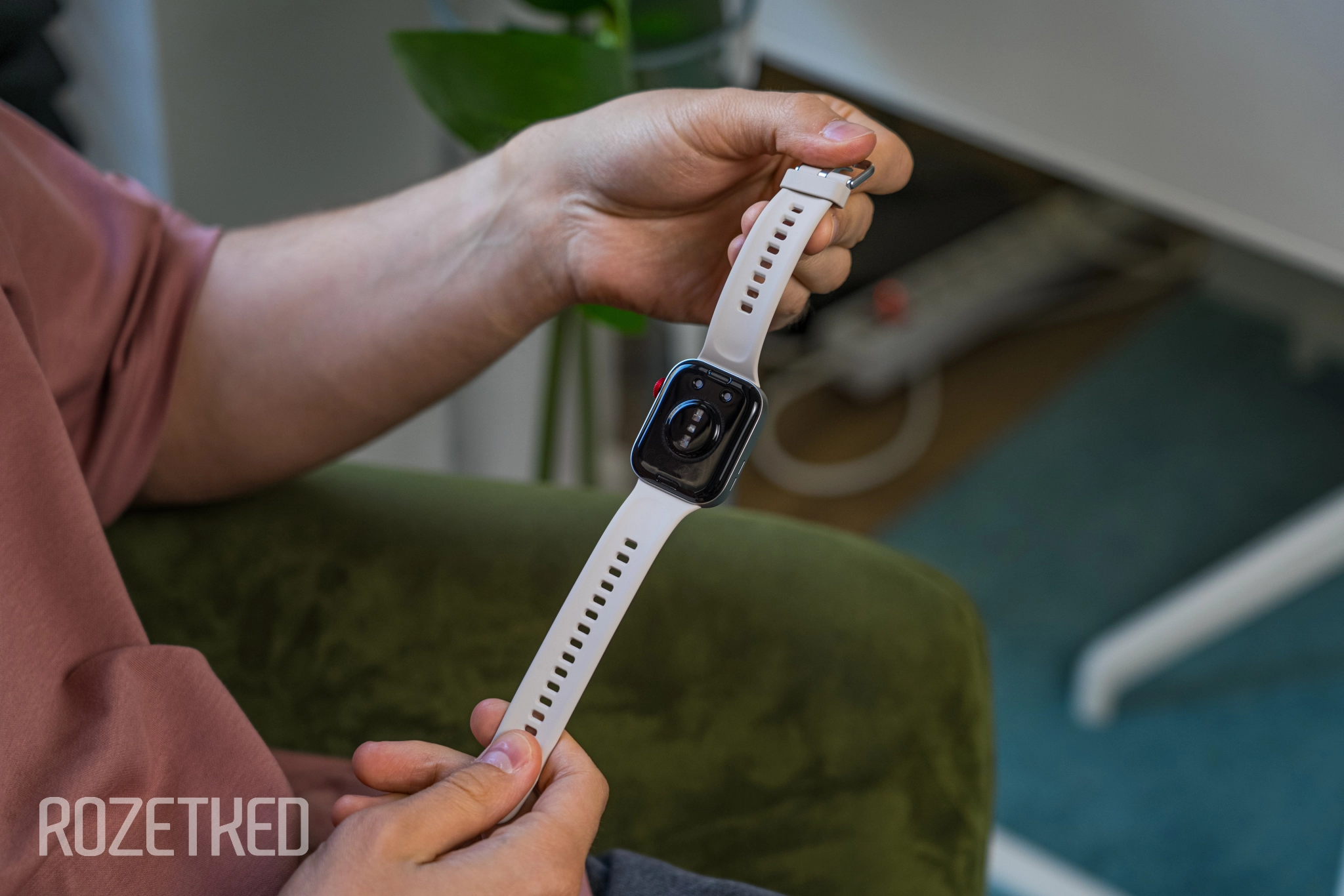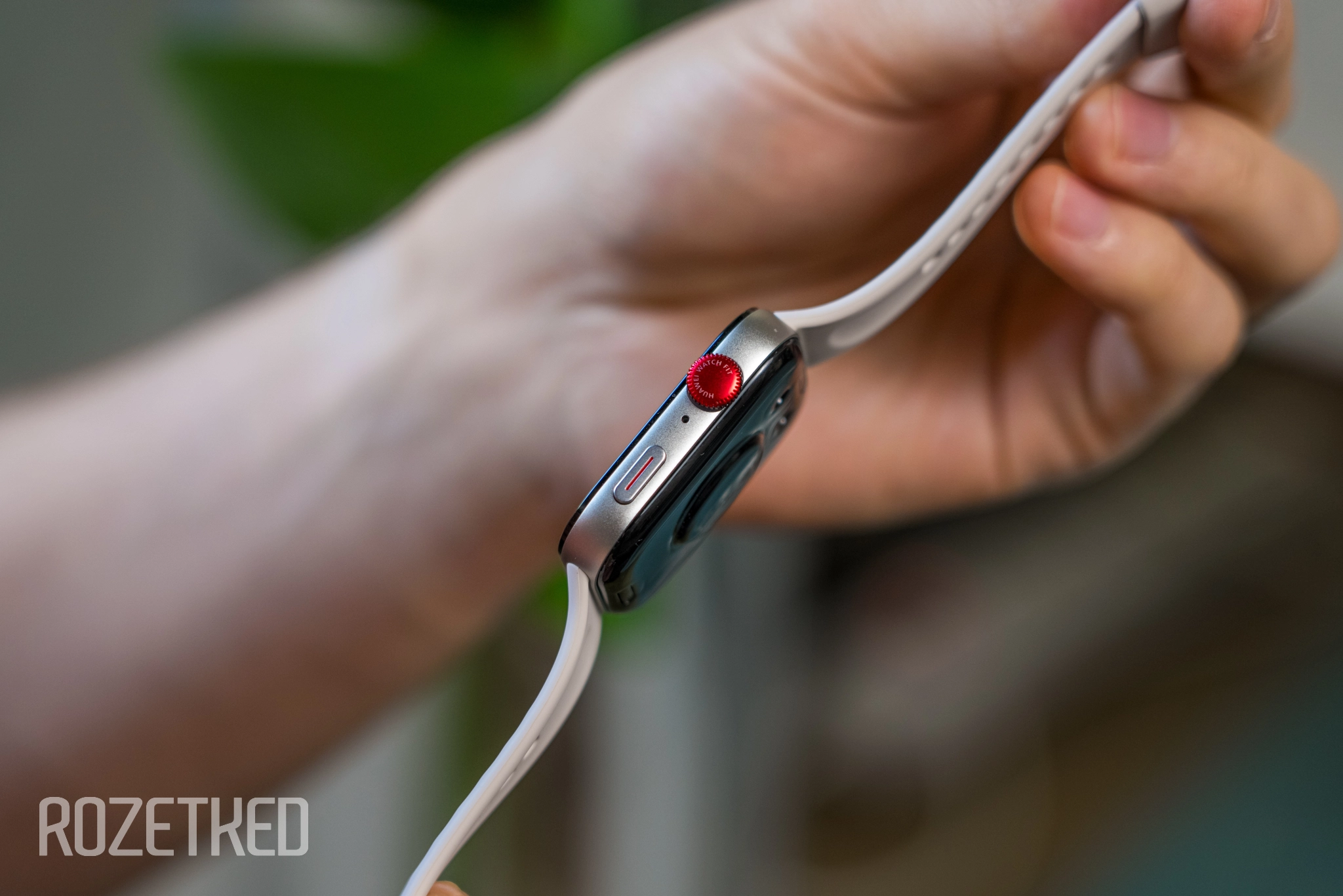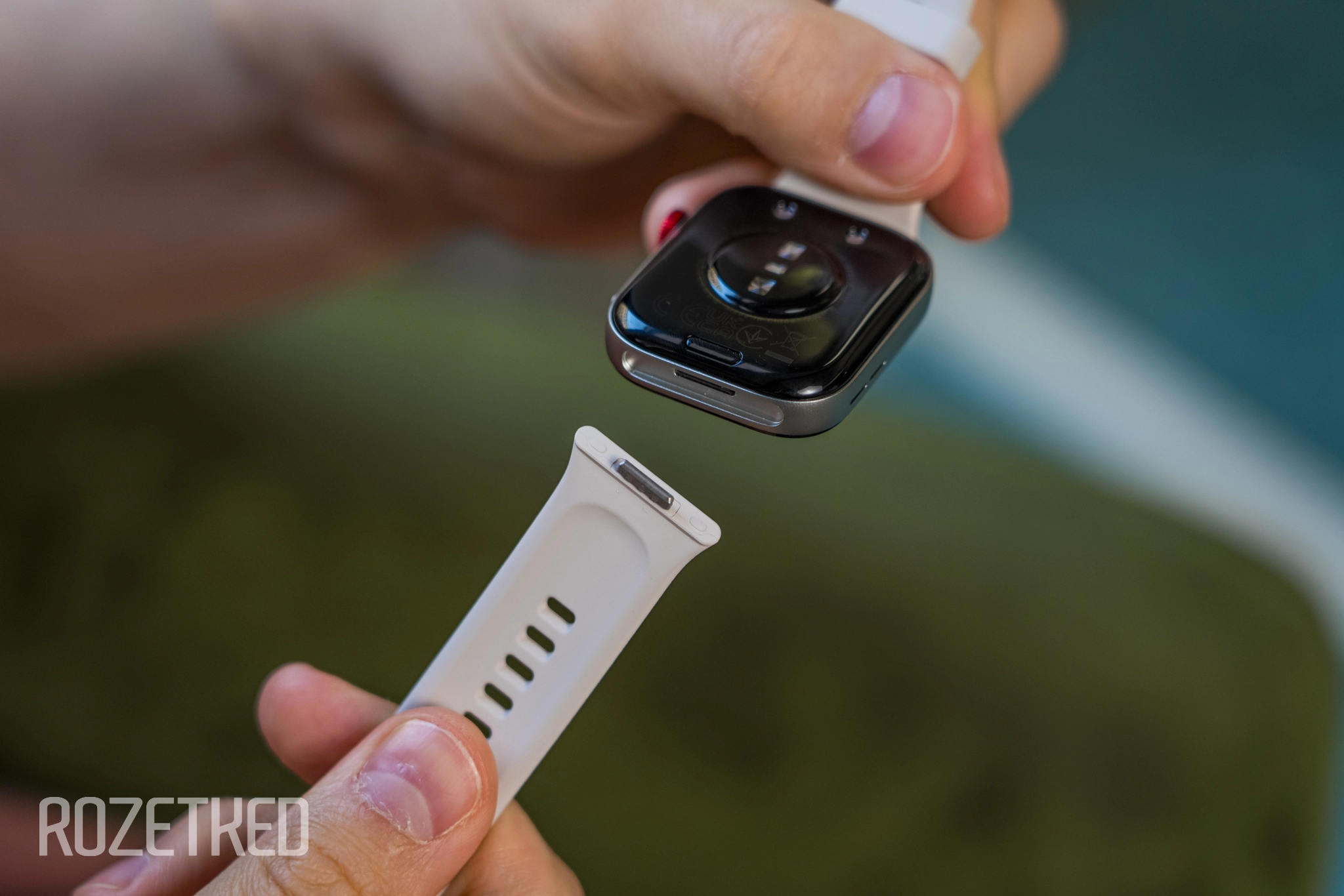 Крепление у ремешка нестандартное, любые сюда не подойдут, только специально созданные под такое крепление. Освобождаются из крепления ремешки так же, как в Apple Watch — нажатием кнопок на нижней панели корпуса. Тогда надёжные металлические штырьки отпускают ремешок. Только здесь надо вытягивать его не в сторону, а на себя.