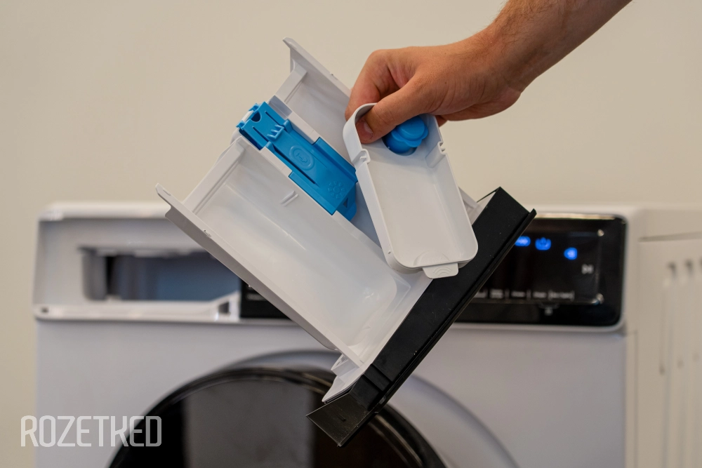 Лоток для добавления моющих средств состоит из трёх отделений. Справа — для предварительной стирки, левое — для основной стирки, а по центру заправляется кондиционер. Плоскостей в этой сборной детали много, поэтому предусмотрена возможность полного изъятия и разбора лотка для чистки и сушки. Для этого необходимо вжать голубую защелку, которая одновременно выполняет еще и функцию индикатора максимального уровня жидкости.