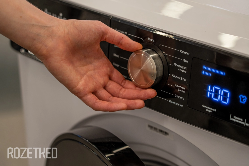 Панель управления имеет небольшой скос, чтобы было удобнее читать надписи и информацию на дисплее. В левой части панели расположен круглый поворотный селектор с выбором программ. Правую часть занимает яркий светодиодный дисплей с крупными наглядными цифрами и сенсорными кнопками управления.