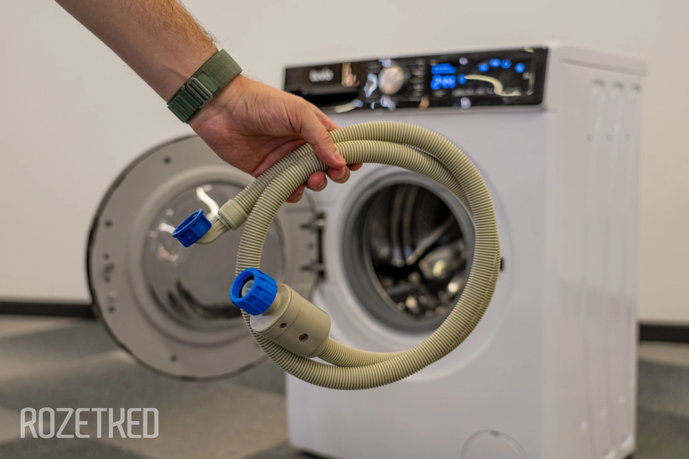 Комплектация у стиральной машины традиционная. Сама машина идёт с уже установленным сливным шлангом, а заливной шланг и четыре пластиковые заглушки для отверстий от транспортировочных болтов вложены в комплект. Перед началом эксплуатации транспортировочные болты, удерживающие барабан в закрепленном положении, нужно удалить и прикрыть заглушками из комплекта.