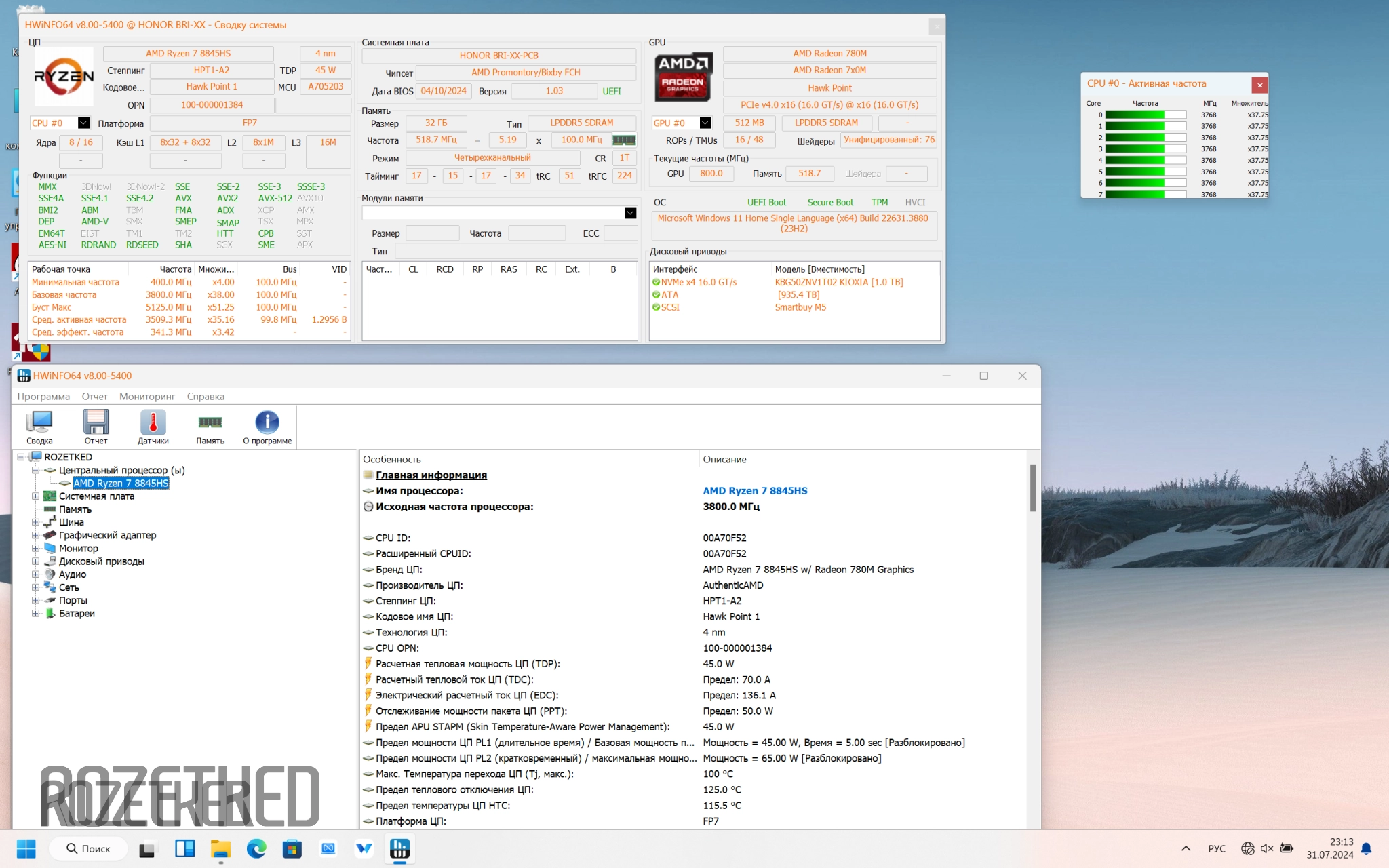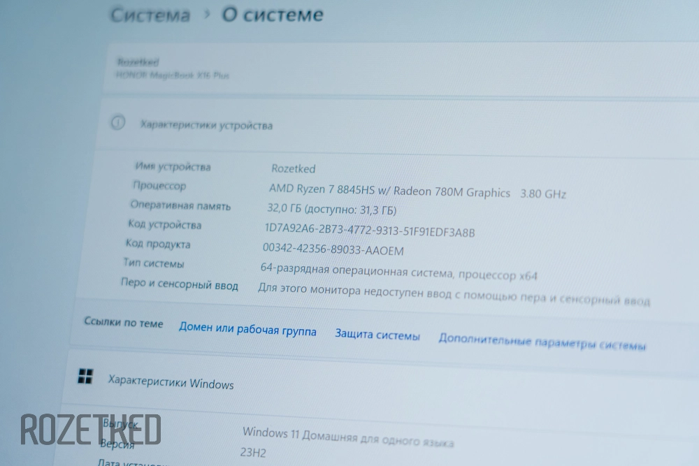 В основе начинки MagicBook X16 Plus установлен процессор от «красных» Ryzen 7 8845HS. Он имеет 8 ядер при 16 потоках, и работает с базовой частотой 3,8 ГГц, разгоняясь максимально до 5,1 ГГц. CPU основан на архитектуре Zen 4 при техпроцессе в 4 нм. Базовое значение TDP составляет 45 Вт.