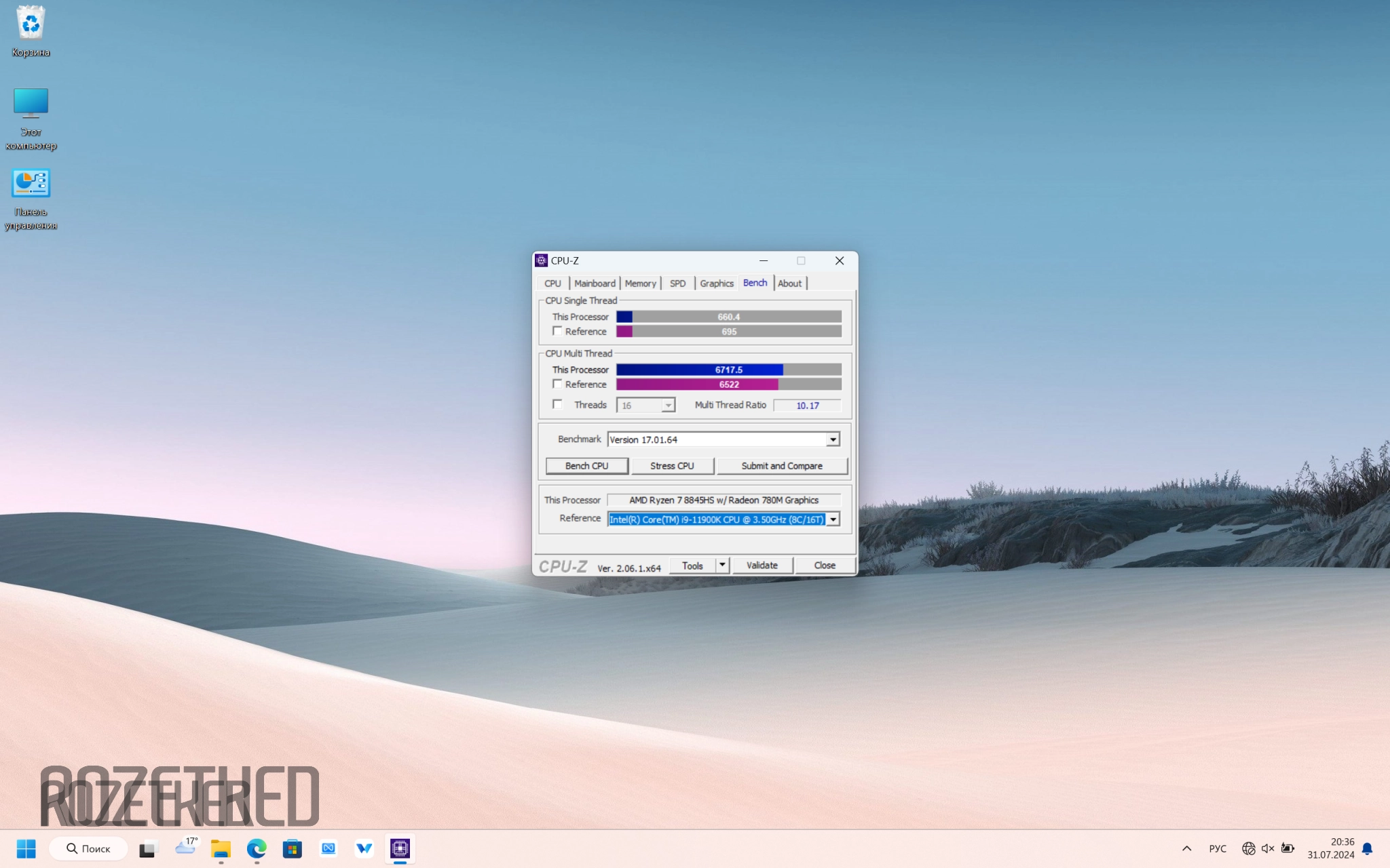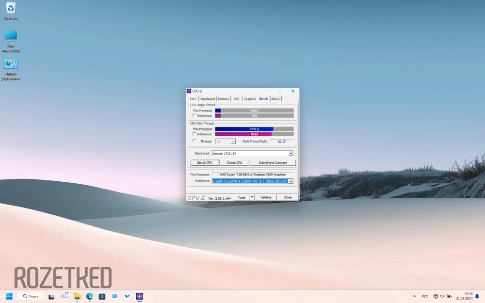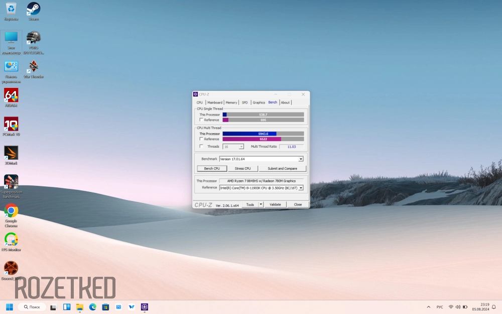 Результаты процессора в CPU-Z для сбалансированного режима оказались немного хуже таковых у настольного топового Core i9 11-го поколения. В нагрузке на одно ядро Ryzen 7 8845HS набрал 538,7 баллов, а на все ядра — 5943,6.