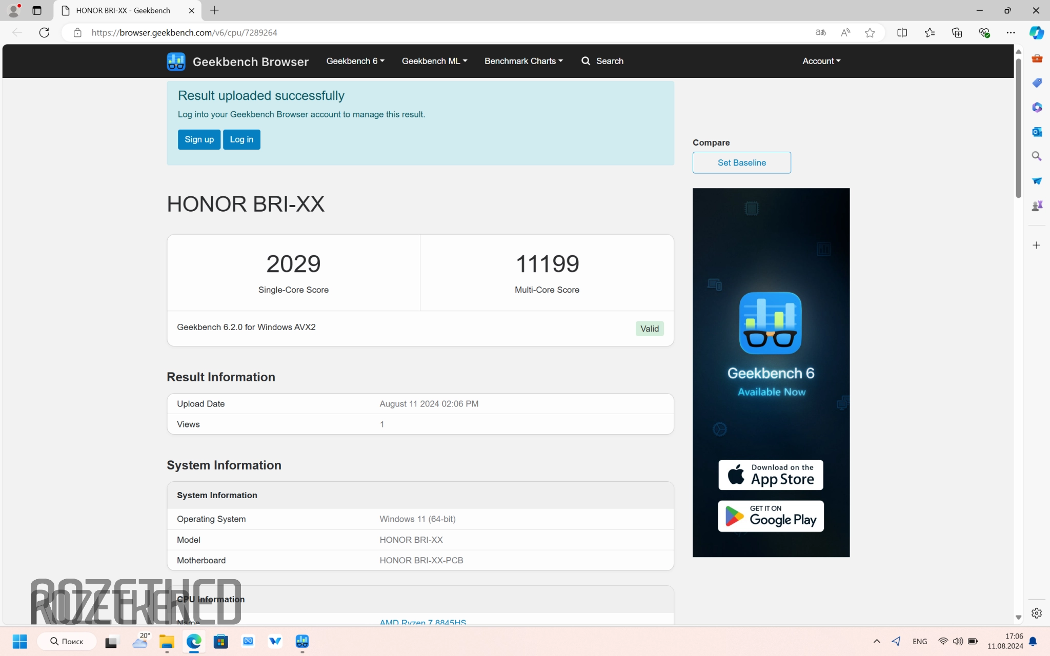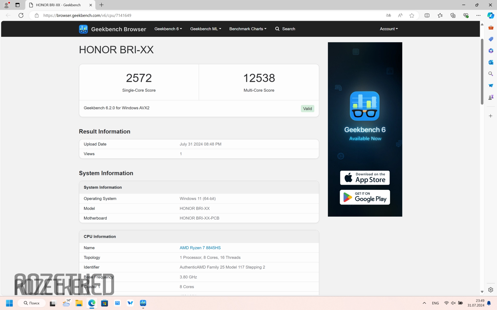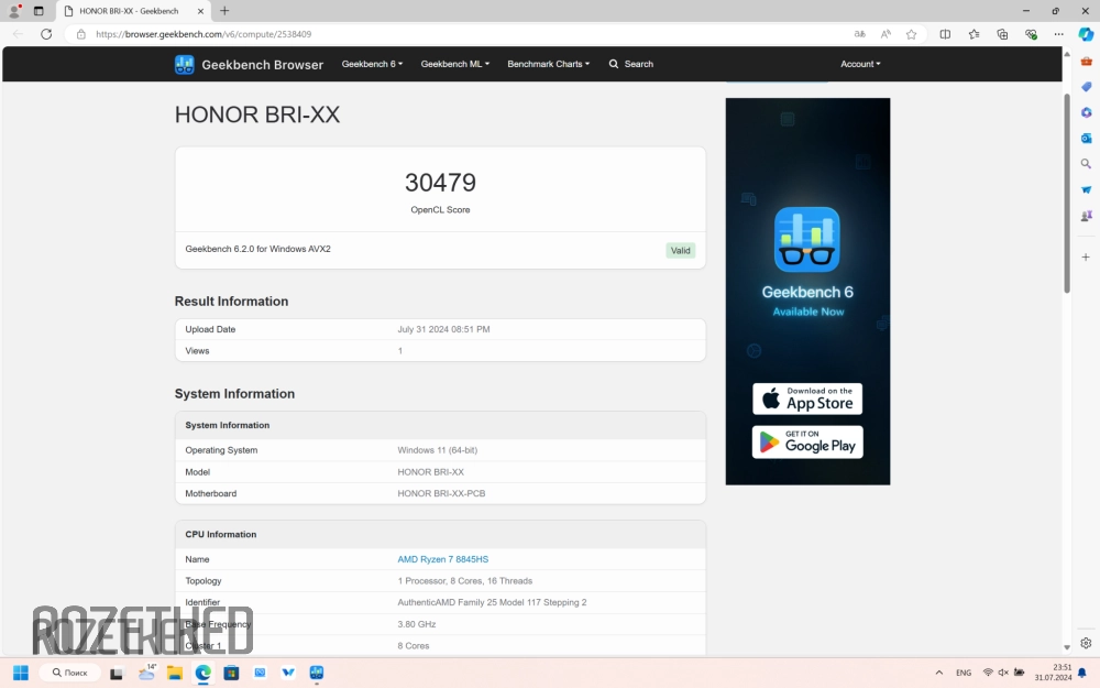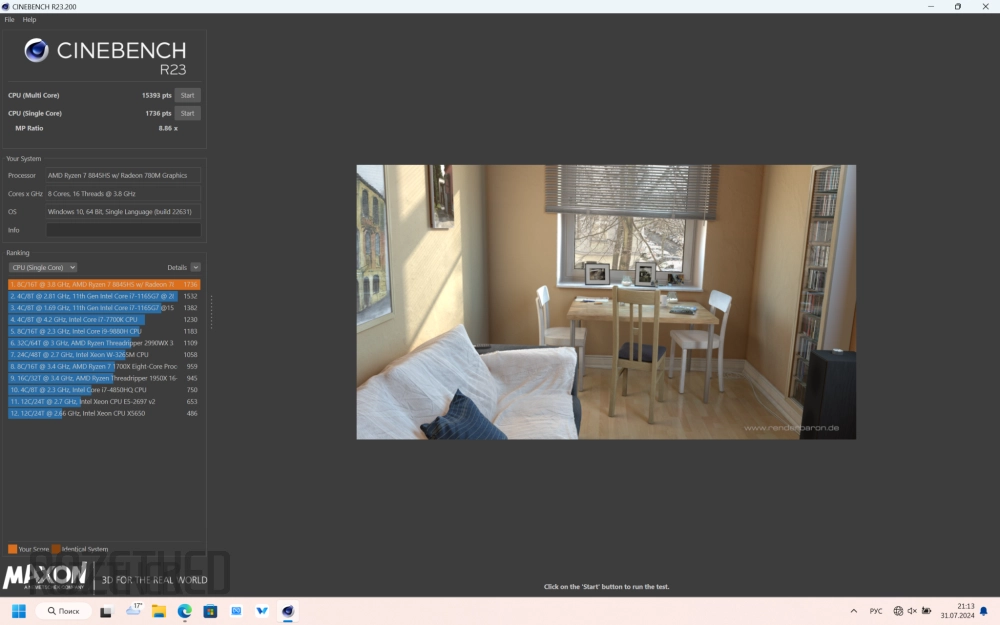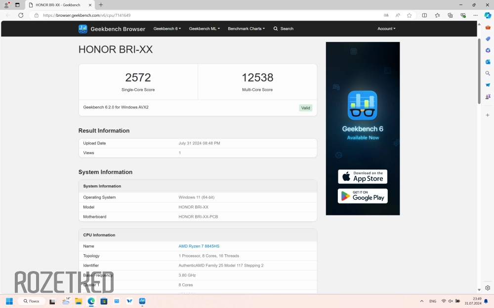 В Geekbench6 в нагрузке на одно ядро Ryzen 7 8845HS в сбалансированном режиме получил 2029 баллов, а на все ядра 11 119 — баллов. И снова результаты для производительного режима оказались повыше — 2572 и 12 538 баллов, соответсвенно.