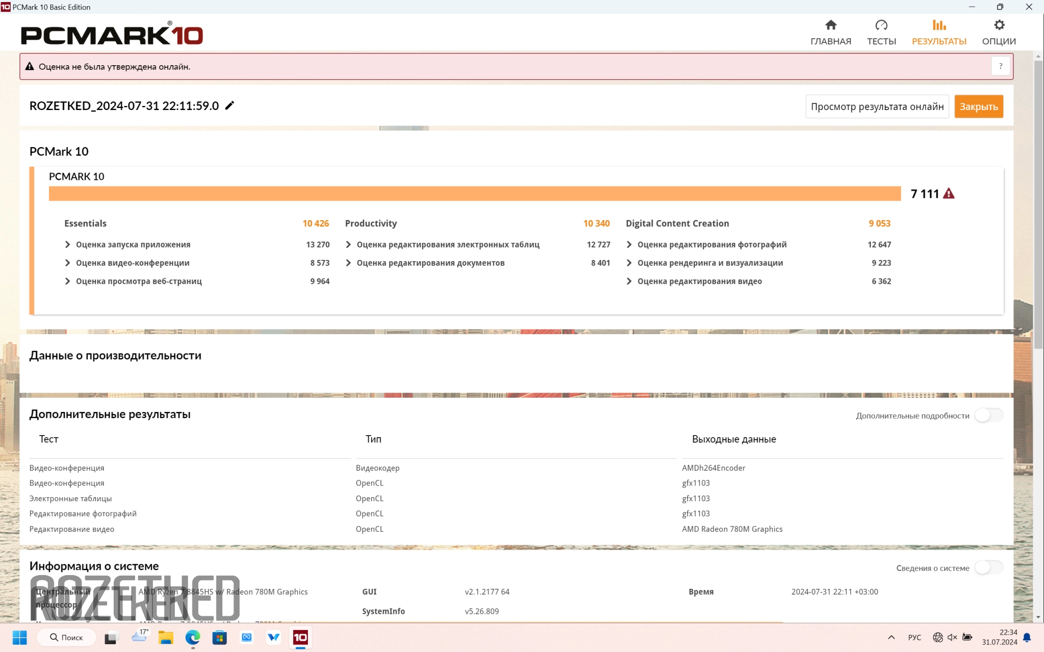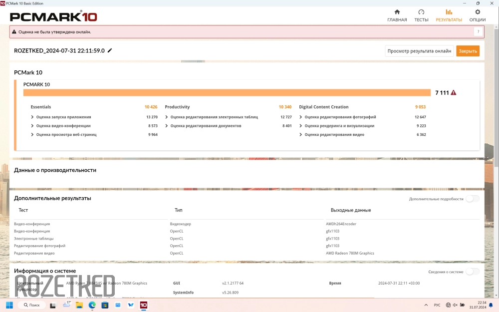 В производительном режиме цифры, ожидаемо, выше. Essentials — 10 426, Productivity — 10 340, Digital Content Creation — 9053, а общая оценка системы — 7111 баллов.