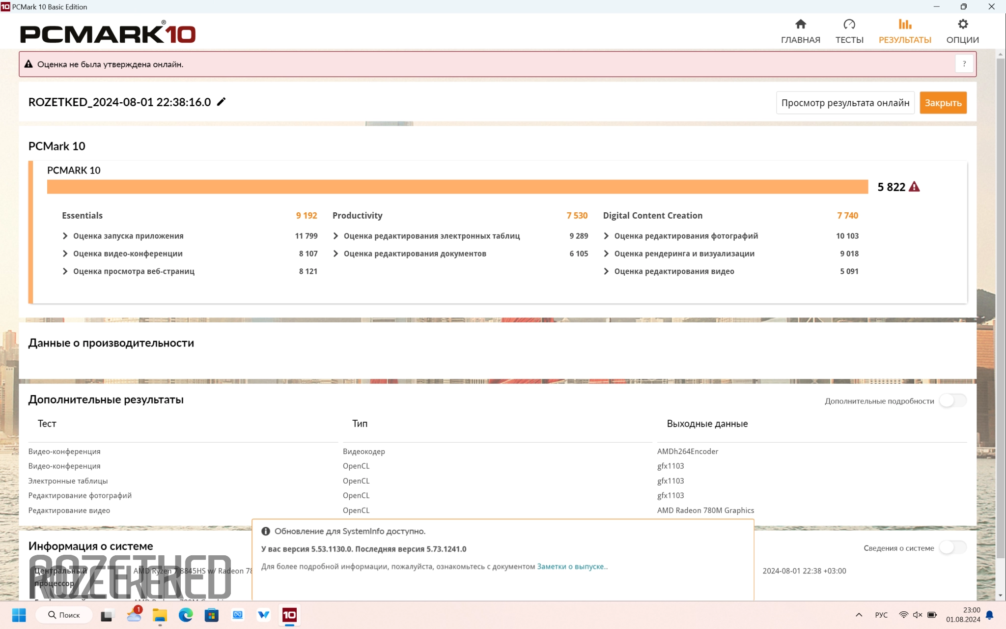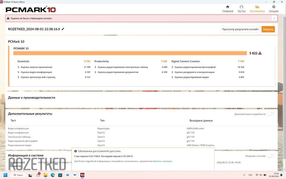 Итак, PCMark10. Значения для сбалансированного режима: Essentials — 9192 пункта, Productivity — 7530, Digital Content Creation — 7740. Общая оценка системы при этом 5822 балла.