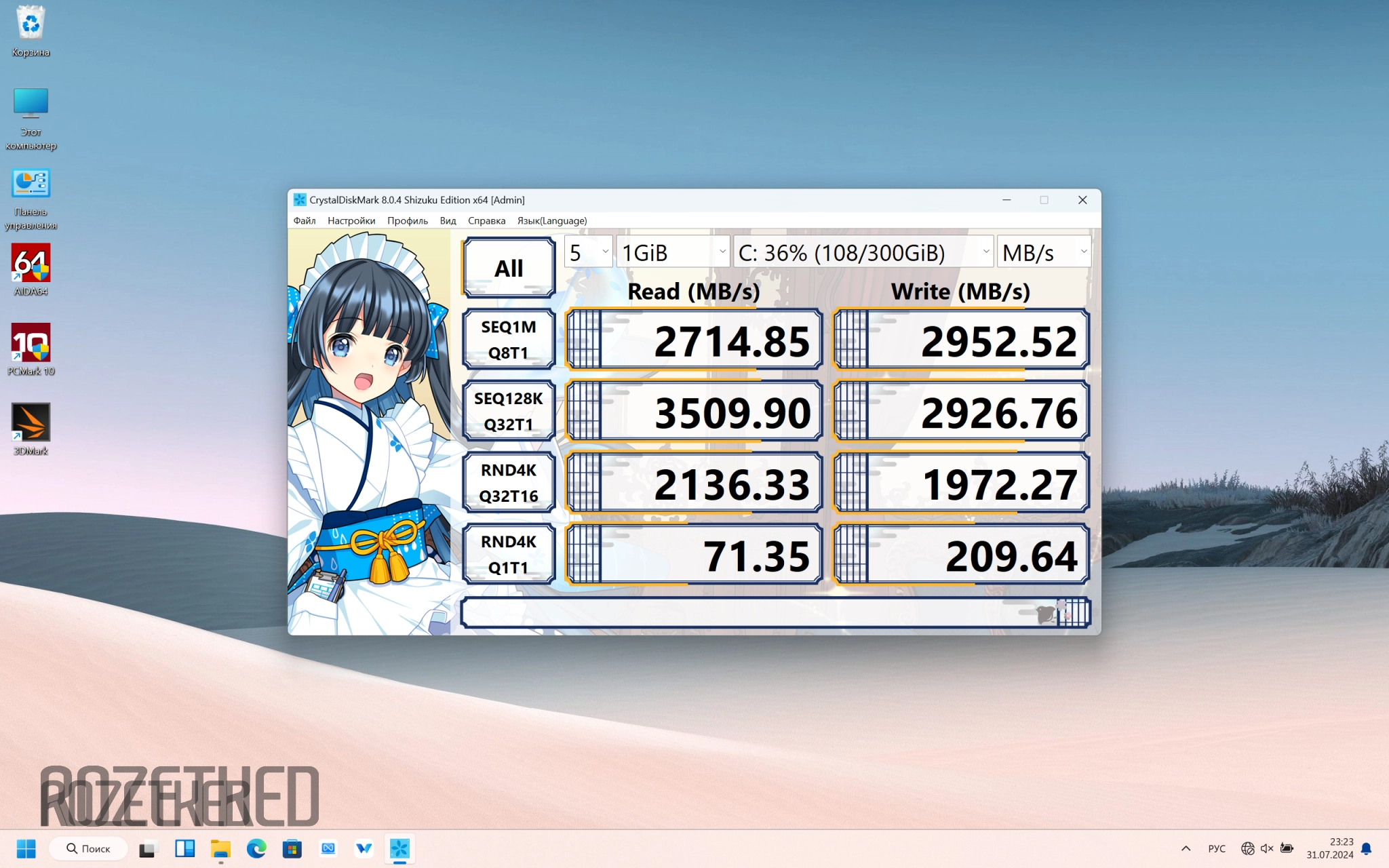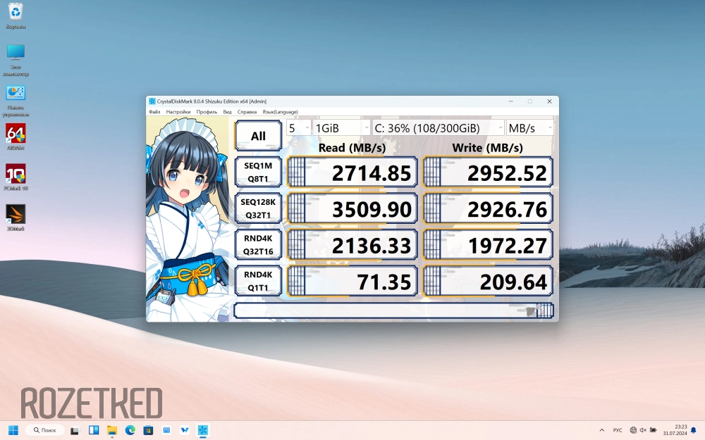 А вот такие получись результаты для встроенного SSD-накопителя в CrystalDiskMark. Последовательное чтение до 3510 МБ/сек, а запись около 2950 МБ/сек. Работа с мелкими рандомными файлами сравнительно тоже на довольно высоком уровне — 71,35 МБ/сек — чтение, 209,64 МБ/сек — запись. В целом, даже для NVMe-диска показатели выше среднего, что не может не радовать.