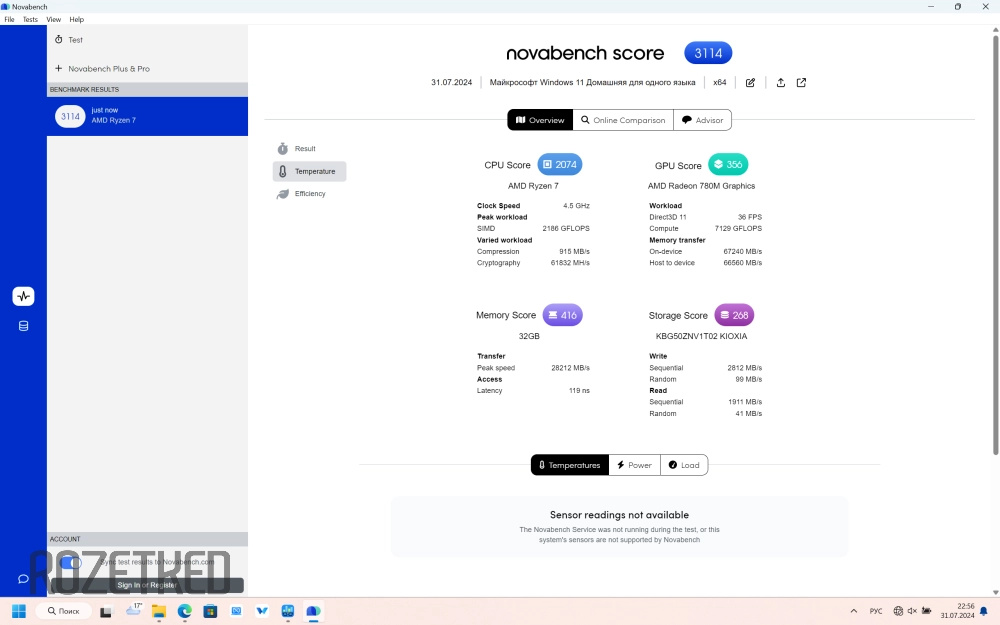 В производительном циферки пободрее: 2074 балла — оценка процессора, 2186 ГФлопс — его производительность, и 3114 — общий балл системы.