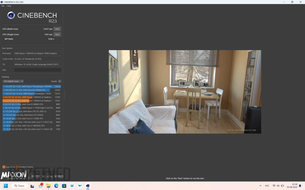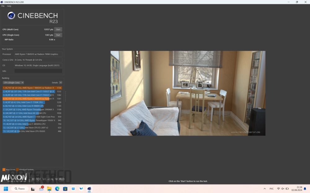 В Cinebench R23 оценка Single Core составила 1361 балл, а Multi Core — 13 557. Таковы показатели в сбалансированном режиме. В производительном — 1736 и 15393 балла, соответственно.