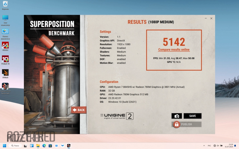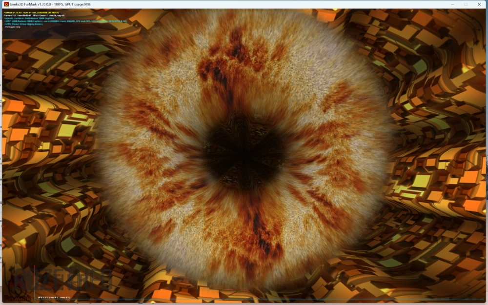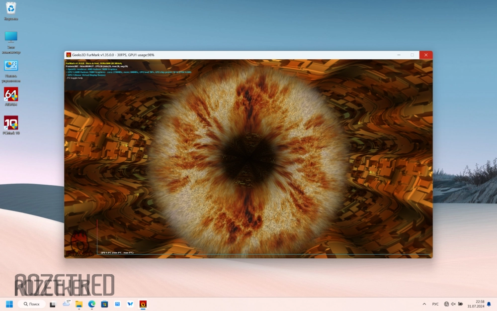 А что насчёт видеокарты? А её показатели довольно высоки, учитывая, что это интегрированное решение. Судите сами: оценка в Superposition 5142 баллов, результат в Geekbench 6 — 30 479 «попугаев», а «бублик» в FurMark 1.35 при разрешении FullHD крутится в 30 FPS. В нативном разрешении — 18 FPS.