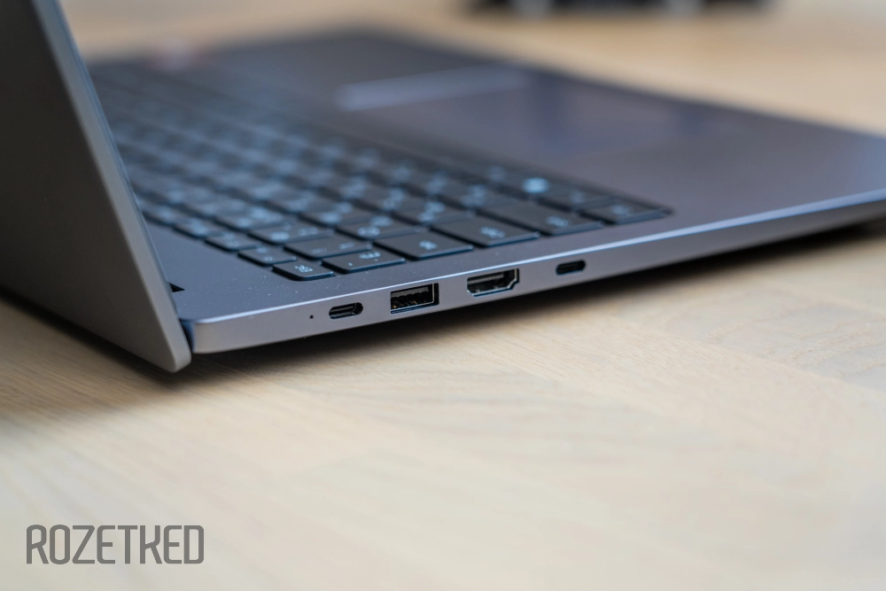 Все основные разъёмы находятся по бокам корпуса. Особенно ими богата левая сторона: здесь тебе и целых два Type-C, и классический Type-A с версией USB 3,2 Gen 1, и HDMI, а также маленький светодиод срабатывающий во время работы или зарядки ноутбука.