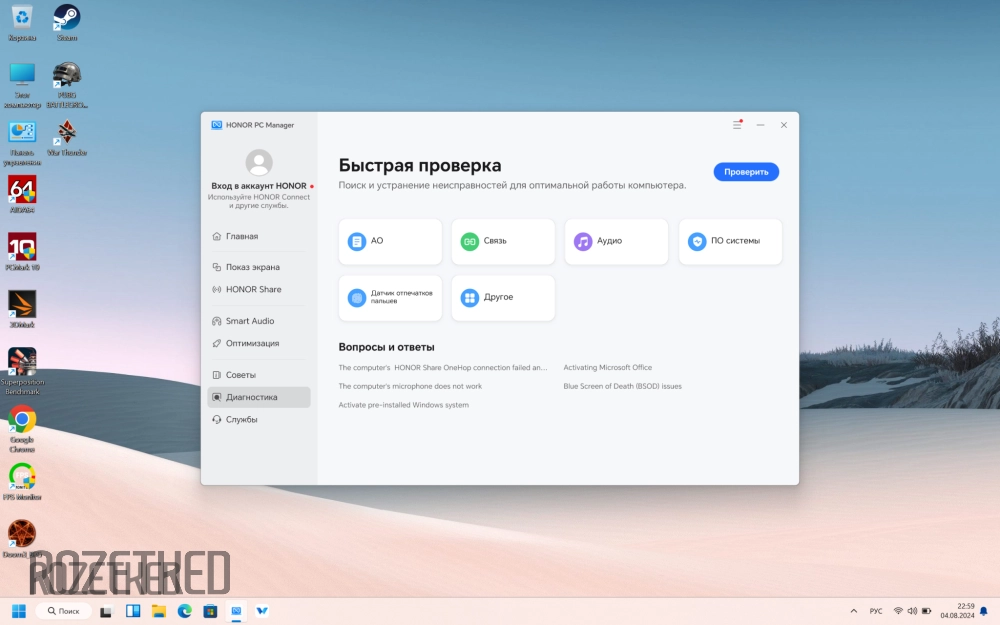 Ноутбук поставляется с ОС Windows 11 Home с поддержкой одного языка. Кроме этого на борту присутствуют собственные предустановленные сервисы Honor PC Manager, позволяющие объединить лэптоп с другими устройствами компании в единую экосистему.