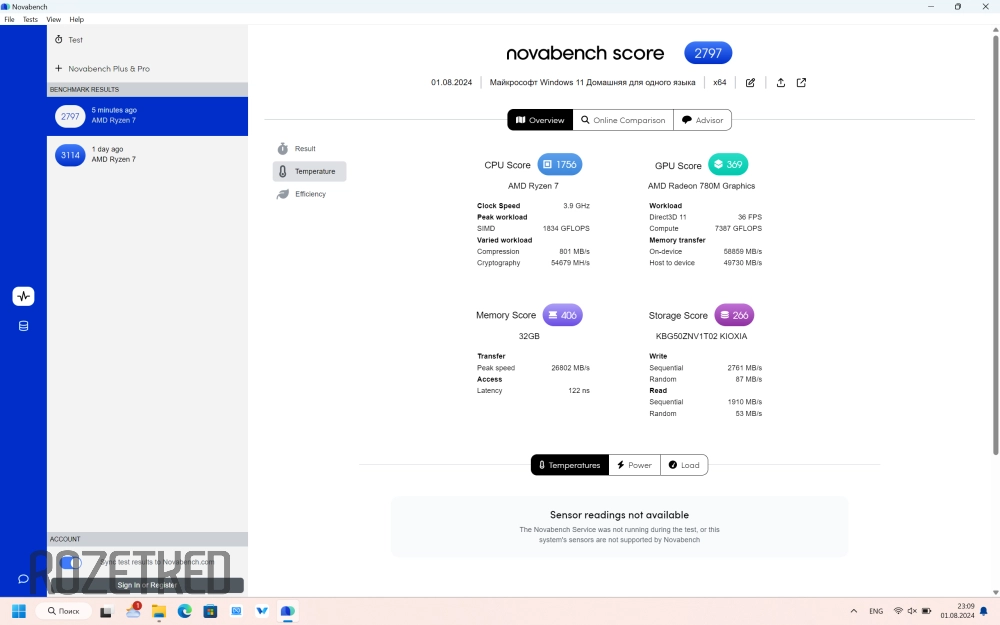 Так же и в Novabench 5. Оценка процессора в 1756 баллов при мощности в 1834 ГФлопс дают общий результат в 2797 баллов в сбалансированном режиме.