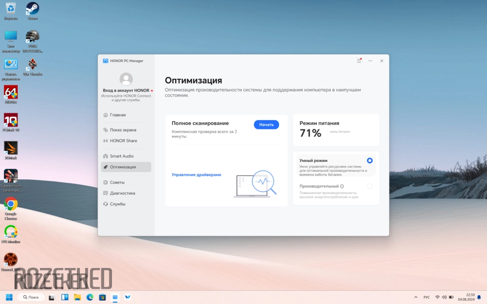 На этом теоретические выкладки закончились, пора переходить к тестам. Стоит заранее отметить, что в ноутбуках Honor присутствует «Производительный режим», поэтому тесты, касающиеся производительности процессора, Запускались в обоих режимах. Опция срабатывает с помощью комбинации клавиш «Fn» и «P», при этом ёмкость аккумулятора должна быть выше 20%, а сам девайс подключен к зарядке.
