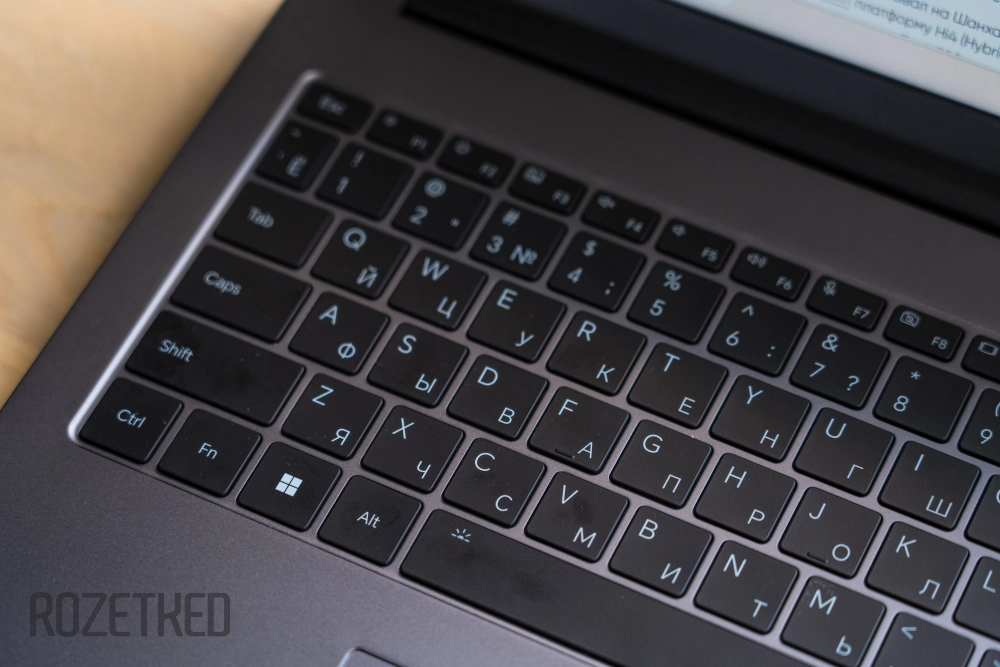Большинство кнопок квадратные со сторонами примерно по 1,6 мм. Высота клавиш верхнего ряда вполовину меньше остальных. При этом стоит отдельно отметить, что клавиши со стрелками «вверх» и «вниз» имеют полноценный размер. Сейчас обычно производители ноутбуков любят делать их укороченными для экономии места на палубе устройства, но это создаёт определённые неудобства при использовании стрелок.