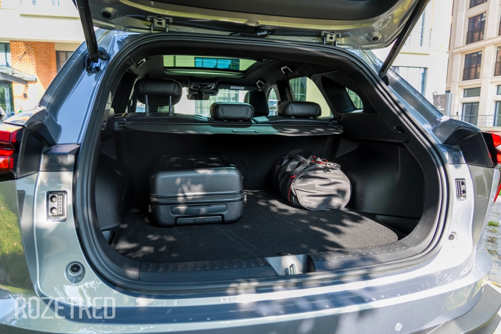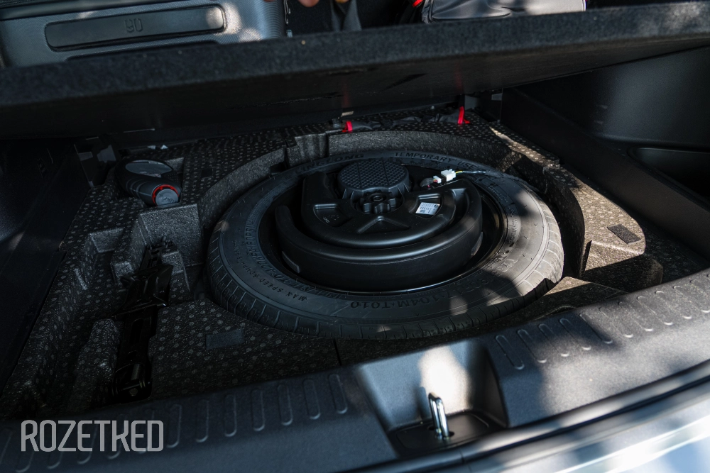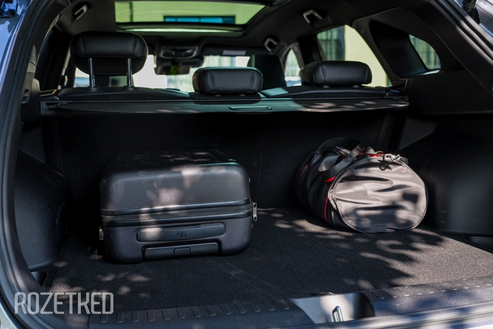 Багажник с электроподъёмом, объём 376 литров, со сложенными сидениями 1328 литров. Не скажу, что он объёмный, просто стандартный — коляска детская поместится, несколько чемоданов тоже. Сиденья складываются в пропорции 60:40. В багажнике есть розетка 12 В и отсек для мелочей. Под полом докатка, сложенная аккуратно в органайзере из пенопласта.