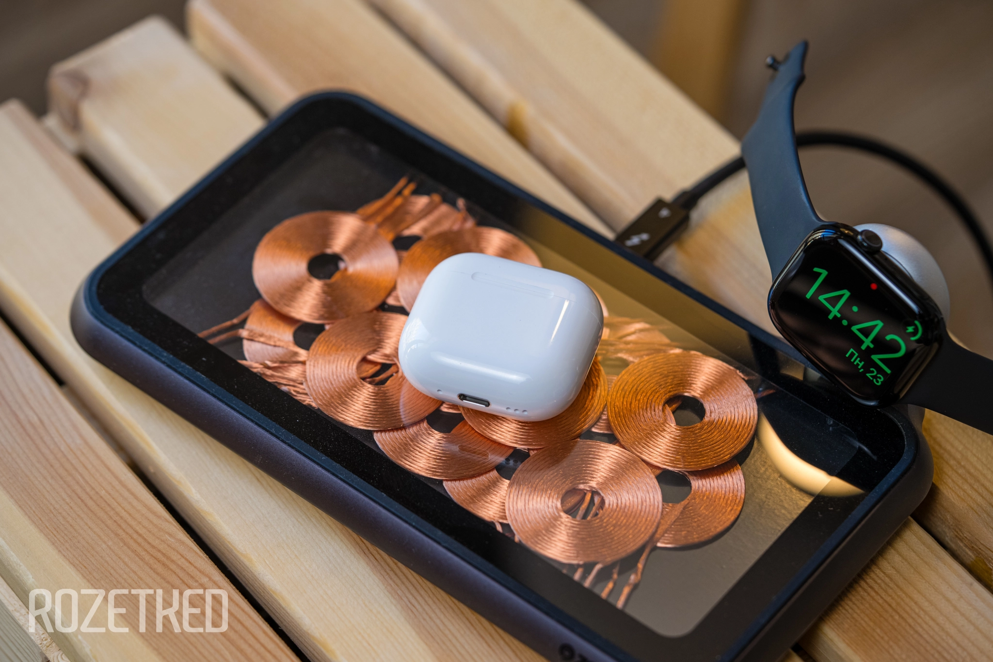 Кейс стал заметно меньше: ширина уменьшилась на 3 мм, высота — на 0,2 мм, вес меньше на 3 грамма, — без труда поместится в маленький карман джинс, хотя и у прошлых с этим проблем не было. Из других изменений — больше нет поддержки MagSafe, но зато заряжать кейс можно с помощью зарядки для Apple Watch.