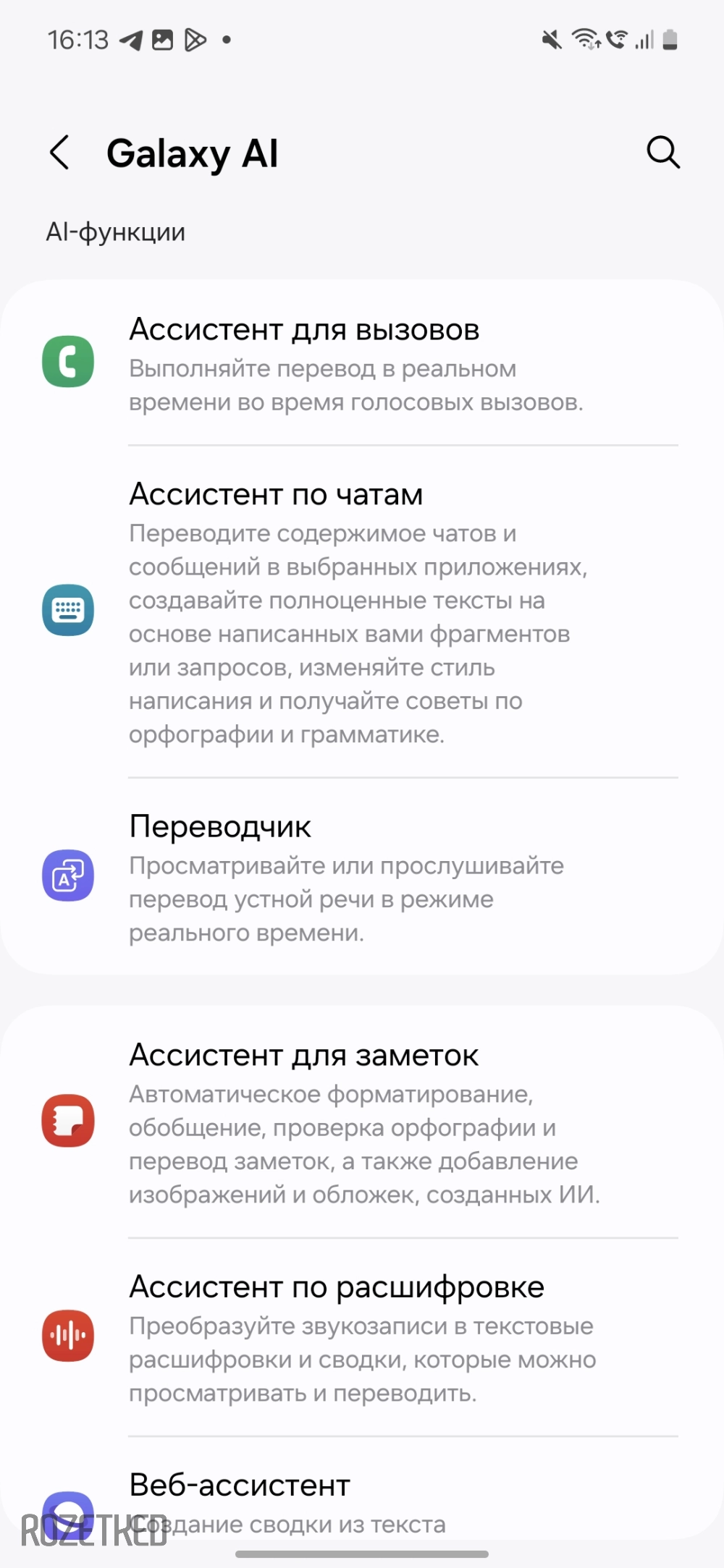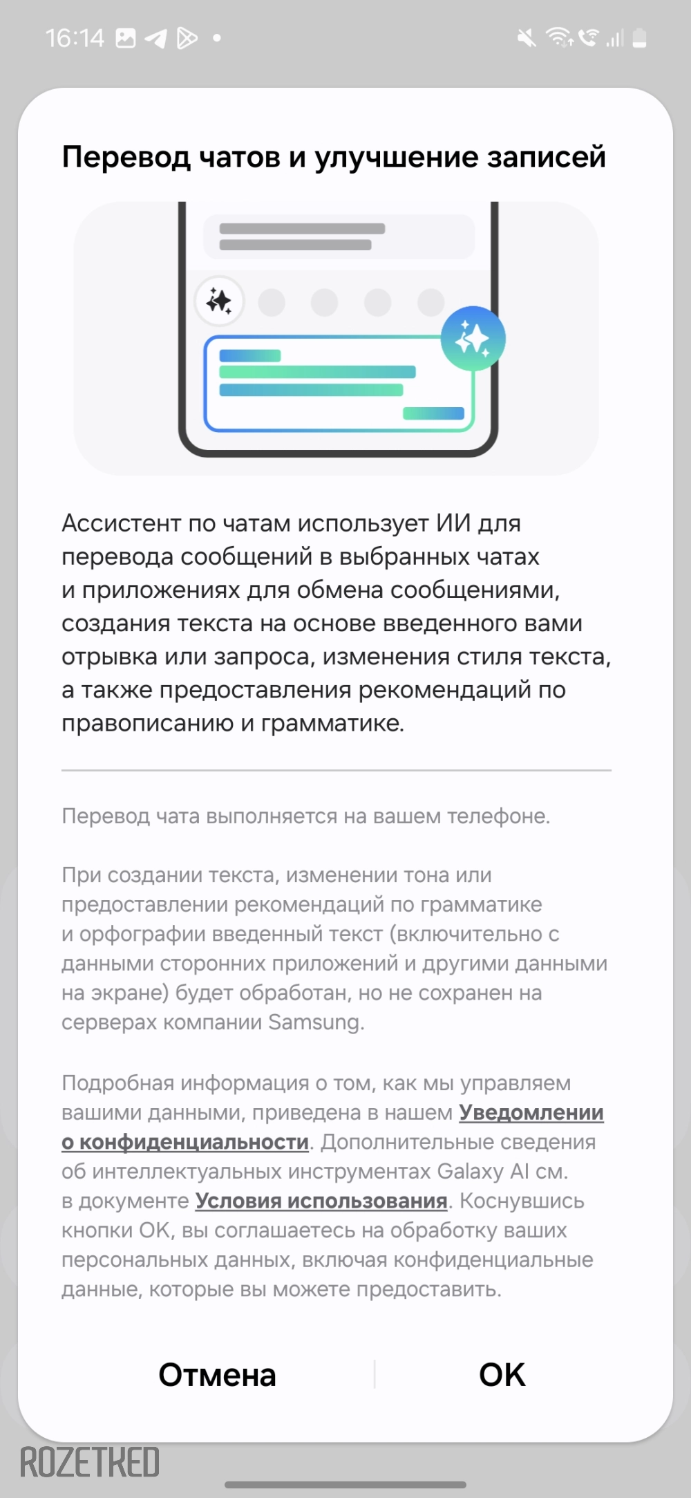 В отдельном меню собраны функции для использования AI. По умолчанию они отключены, а что нужно — решайте уже сами. Возможностей много, начиная от перевода переписки в чатах и разговора по телефону в реальном времени для обоих собеседников до расшифровки голосовых записей в текст.