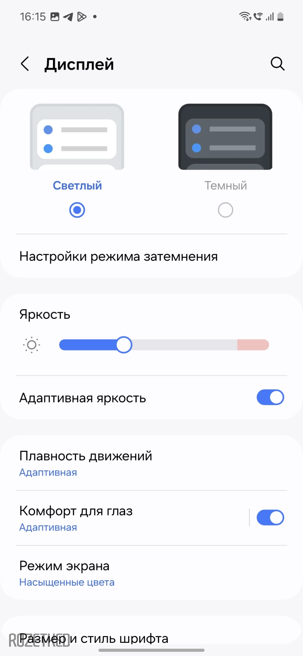 Среди настроек можно встретить светлую и тёмную темы оформления, цветовые профили для более сочной или наоборот приглушённой картинки, а также Always On Display с кучей параметров. Меняется цветовая температура экрана, оттенки подстраиваются под освещение. К слову, запас подсветки достаточный для любых условий, дисплей яркий и цветастый.