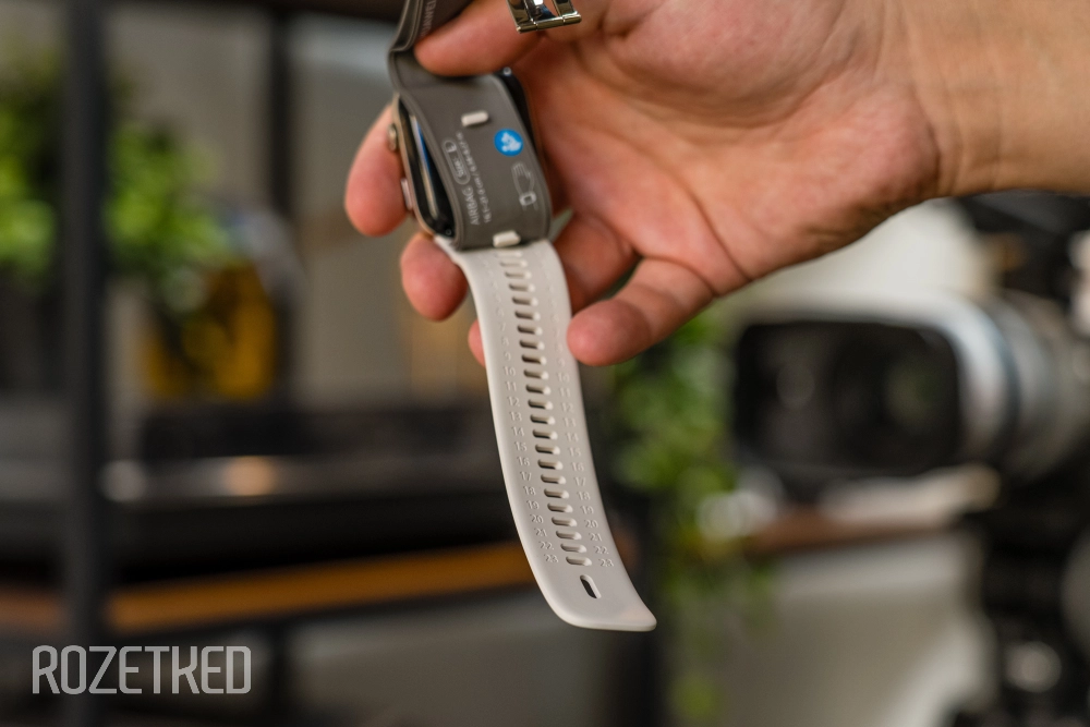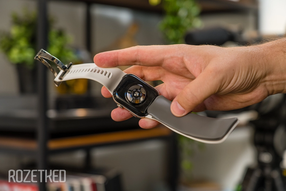 На корпусе Watch D2 есть отверстие под динамик для разговоров, всего одна кнопка справа и функциональное колёсико над ней. Застёжка ремешка простая, на защёлке; достаточно слегка потянуть и ремешок открывается — не уверен, что вариант самый удачный, у меня пару раз ремешок открывался, когда я засовывал руку в рюкзак, например.