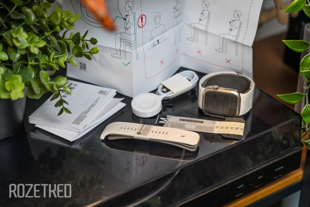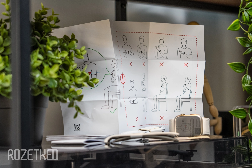Что у нас ещё есть в комплекте? «Шайба» для зарядки с выходом USB-A (адаптер нужно докупать отдельно), специальный браслет из бумаги с нанесёнными цифрами — с его помощью нужно замерить запястье для точного определения размера руки, ремешок с размерами M (130-160 мм) и L (161-210 мм), две манжеты для измерения давления.