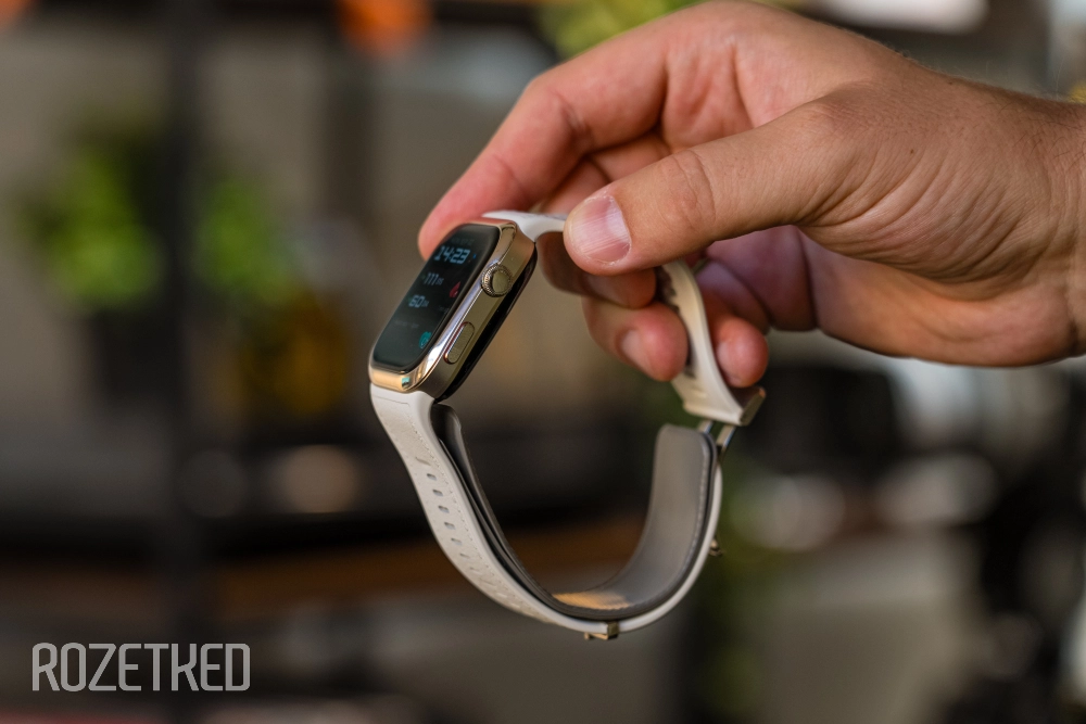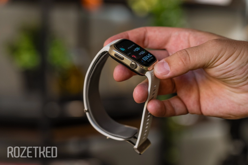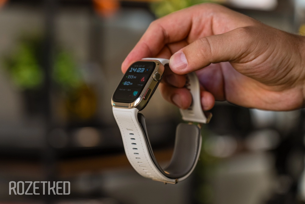 В сравнении с первым поколением изменились габариты, ширина ремешка и диагональ экрана. Теперь тут 1,82-дюймовый AMOLED-дисплей с разрешением 480×408 пикселей (347 ppi) и яркостью до 1500 нит, форма сохранена прямоугольная. Вокруг экрана в светлой версии глянцевый золотой безель— не очень практично. Сам экран прикрыт 2,5D стеклом.