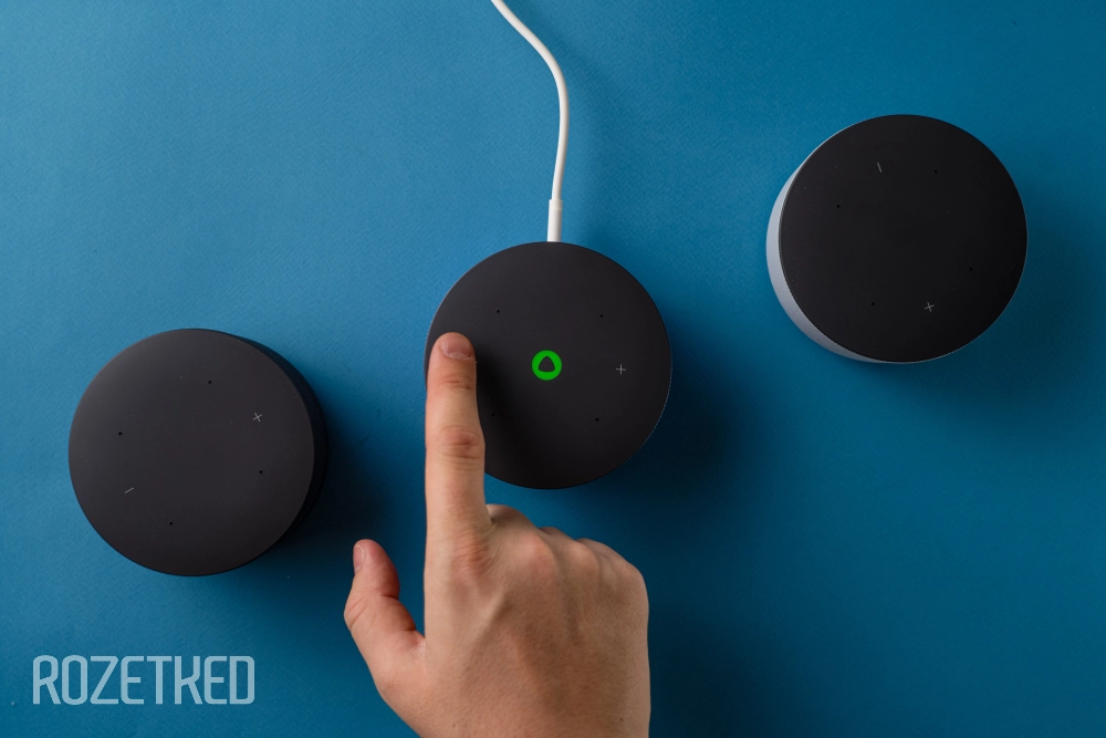 Микрофонов в «Мини 3» стало на один меньше, чем в «Мини 2» — три вместо четырёх, хотя отверстий всё равно четыре. И да, все микрофоны расположены сверху, поэтому если положить что-то сверху, колонка вас не услышит. И ещё одно да — кнопка физического отключения микрофона тоже есть, находится сзади.
