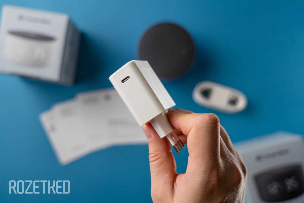Коробка не скрывает ни саму колонку, ни её цвет — всё сразу нарисовано. Внутри скромно: сама колонка, адаптер питания и кабель USB-C на USB-C — вот так ничего себе! Дождались там, где не ждали. Кстати, цвет адаптера и кабеля может быть чёрным или белым в зависимости от цвета колонки.