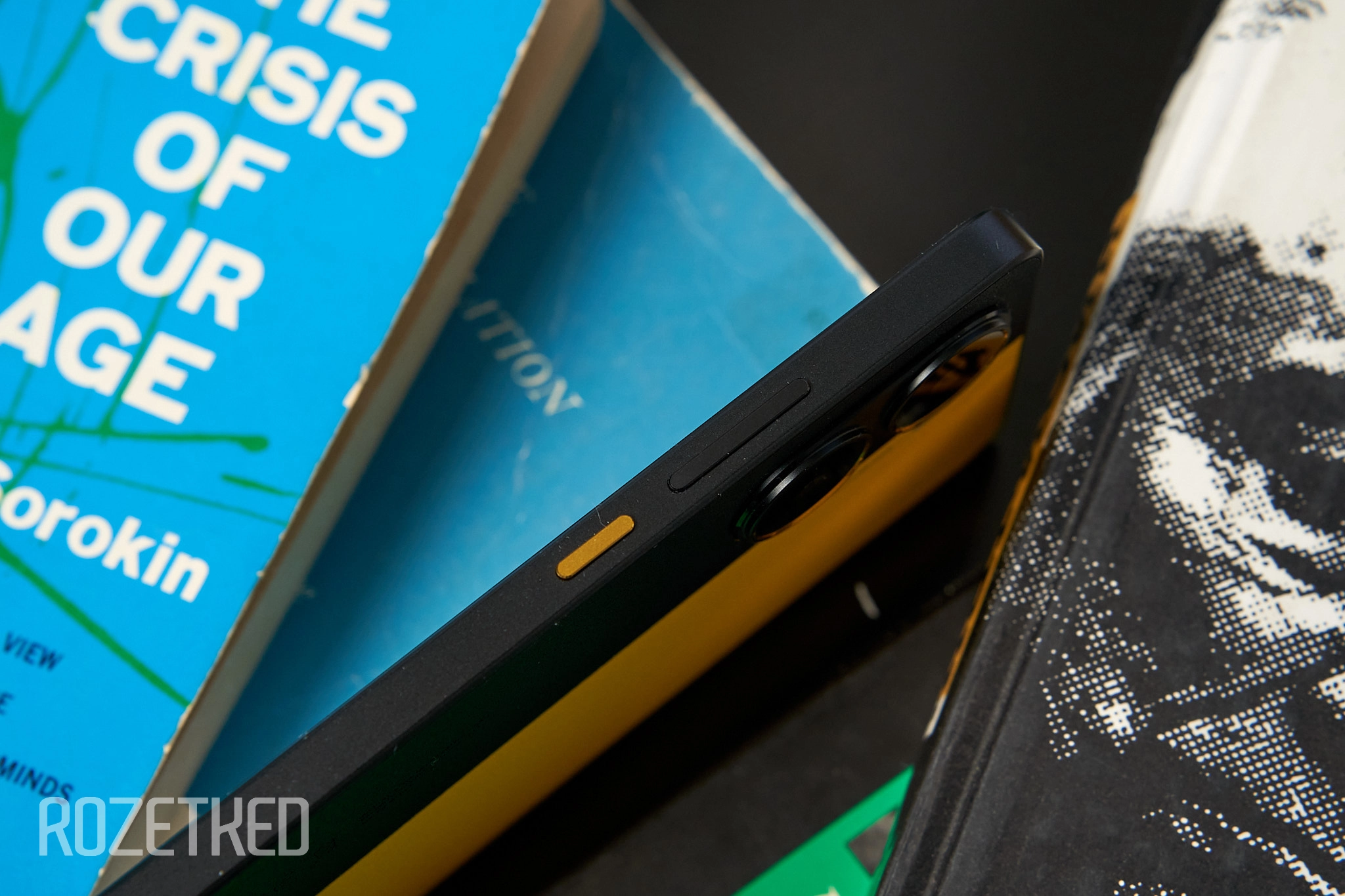 Телефон приехал в смелой расцветке: сочетание чёрного и жёлтого смотрится оригинально, можно даже сказать, что агрессивно. Появляются ассоциации с какими-нибудь спасательными устройствами, спортивной техникой — с чем-то ярким и привлекающим внимание. Если придерживаетесь более скромного стиля, то есть ещё версии в спокойном зелёном цвете и максимально нейтральном чёрном.