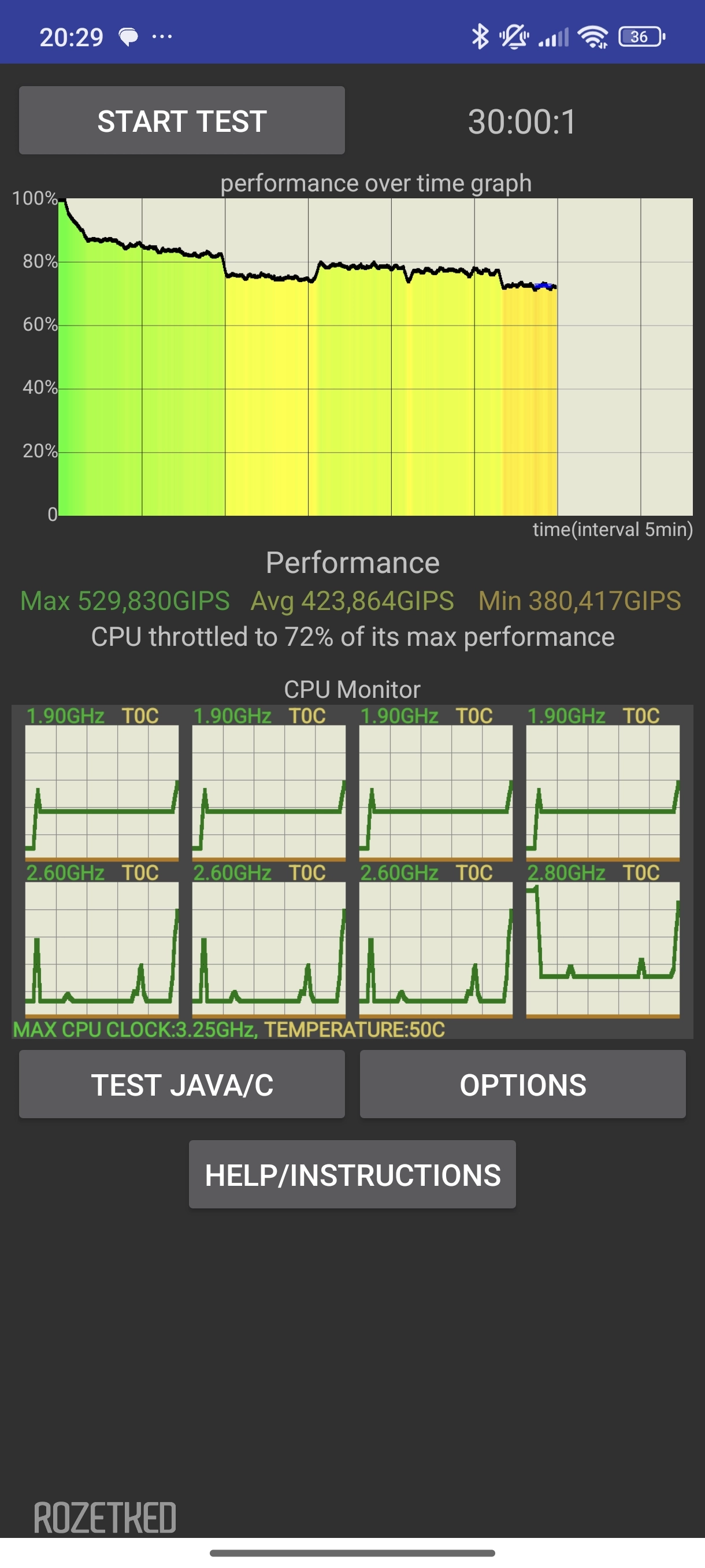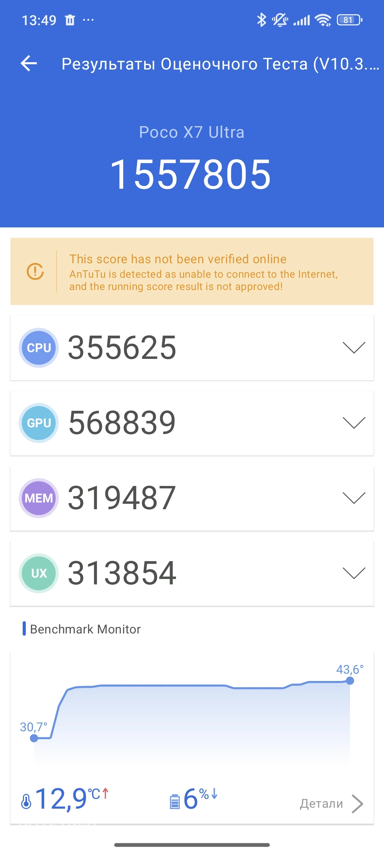 Смартфон отлично работает, он стабильно запускает игры и поддерживает комфортный температурный режим. Не перегревается при обычном использовании, не превращается в сковородку в играх, даже стресс-тесты переносит без избыточного нагрева. По крайней мере, выше 45° температура не поднималась, а это нормальный показатель для таких условий. Но заметил, что после троттлинг-теста вылетает приложение из памяти. Вряд ли вы будете такими вещами в процессе использования смартфона заниматься, но под стресс-нагрузкой производительность падает на 25%.