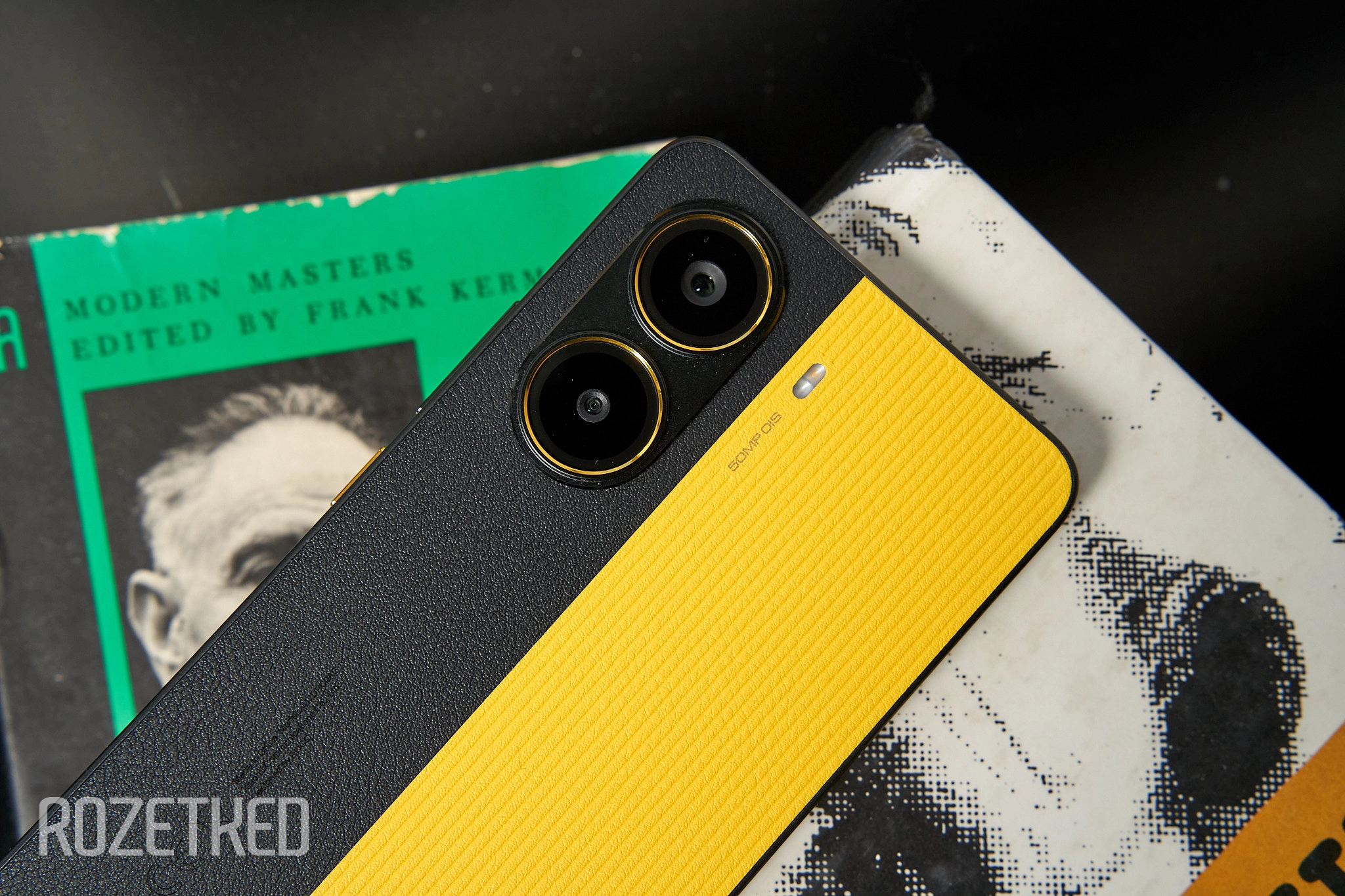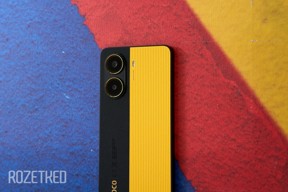 Задняя часть покрыта экокожей, поверхность делится на две половинки. Одна чёрная — она поменьше, а жёлтая побольше. Вдобавок по жёлтой ещё и проходят длинные полосы, создавая рельеф.