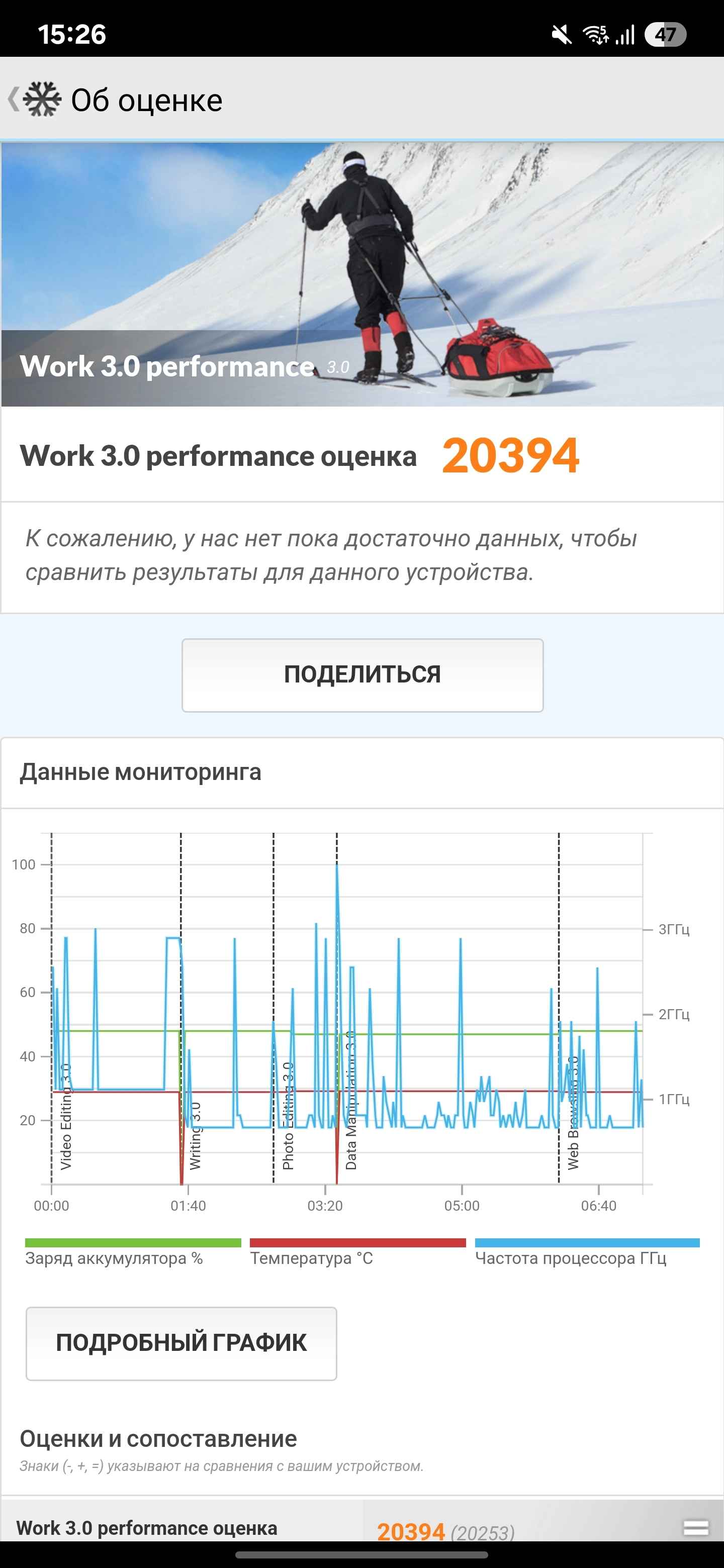 С играми ситуация чуть лучше, чем с бенчмарками. Очевидно, это заслуга увеличенной испарительной камеры. Смартфон не превращается в раскалённую сковородку, но верхний левый угол ощутимо нагревается, а температура процессора поднимается до 45–50 градусов. В течение первых 30 минут частота кадров держится на уровне 60 fps, но после продолжительной игры снижается до 45 кадров в секунду.