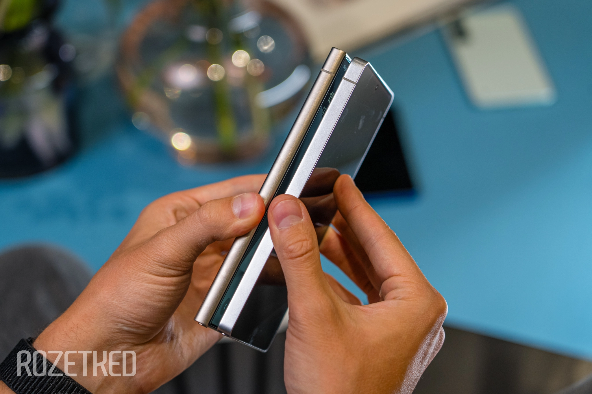 Боковины тут плоские, с матовой титановой отделкой — не скользкие, но и не шероховатые. Сам корпус скользит в меру, а края не врезаются в ладонь. Пользоваться приходится так: одной рукой держишь, второй управляешь — иначе никак. Хотя большинство владельцев сразу спрячут устройство в чехол, однако стекло тут прочное и разбить его не так и просто.