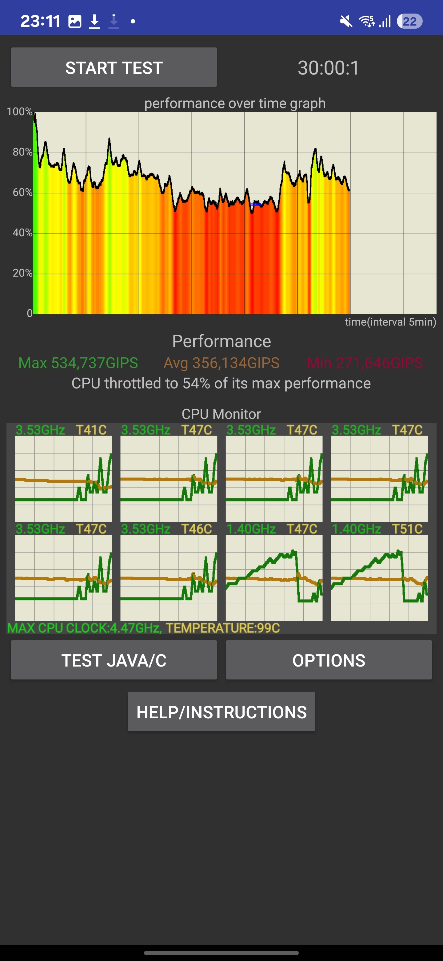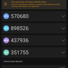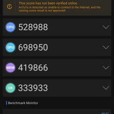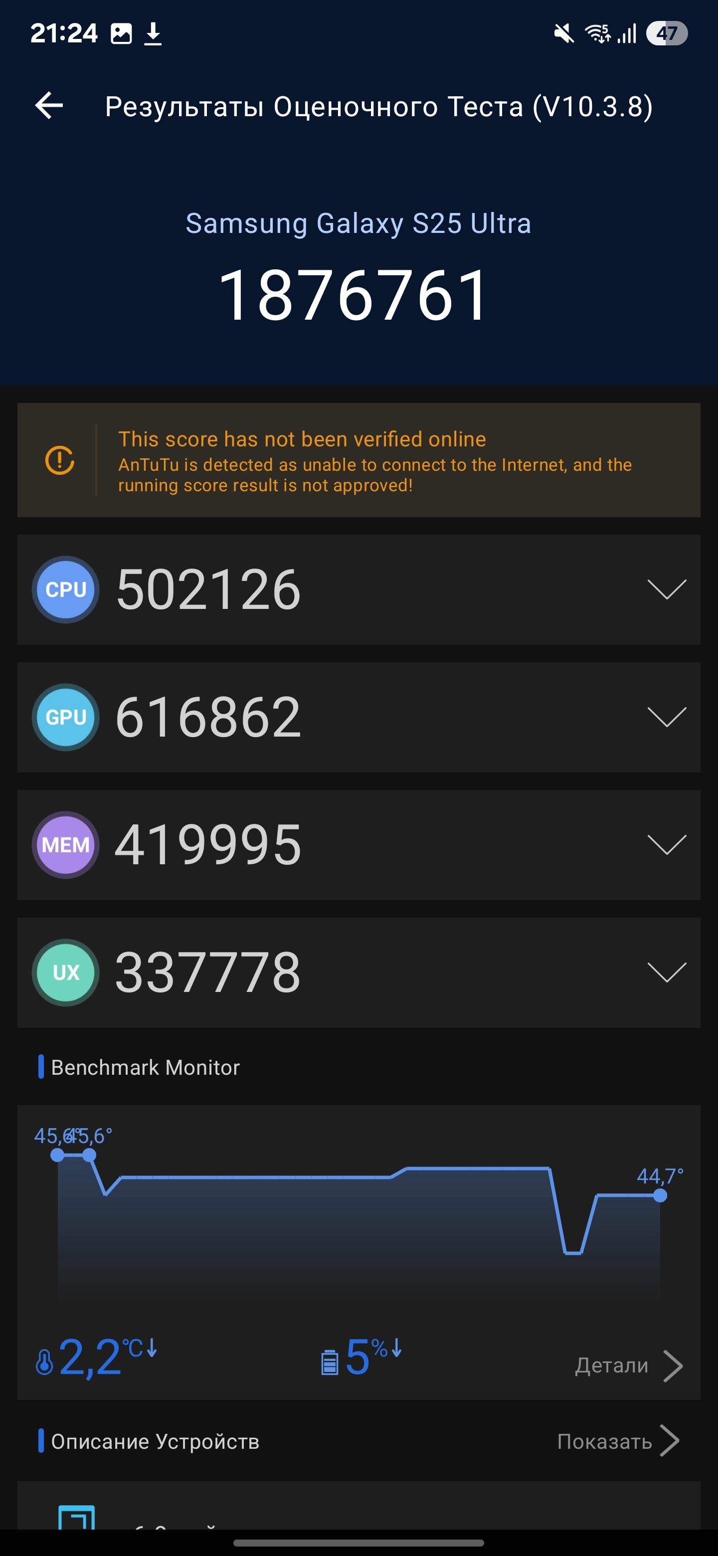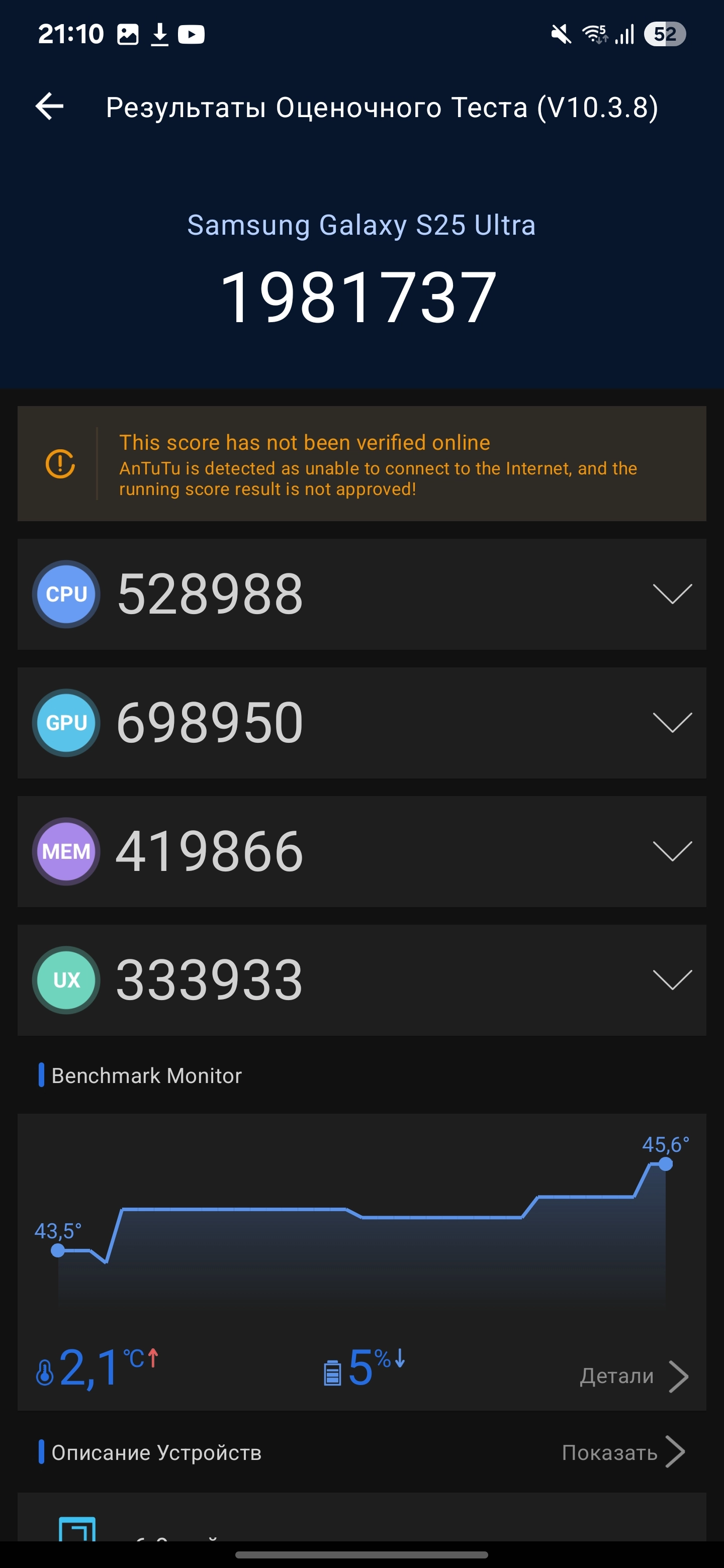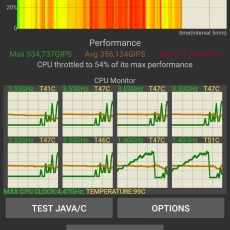 Однако под серьёзной нагрузкой ситуация меняется. В стресс-тесте производительность упала до 31% — график троттлинга окрасился в красный, а максимальные показатели снизились с 605,561 GIPS до минимальных 179,246 GIPS при среднем значении 340,325 GIPS. В AnTuTu картина похожая: первый прогон выдал 2,2 млн баллов, но уже на третьем запуске результаты заметно просели.