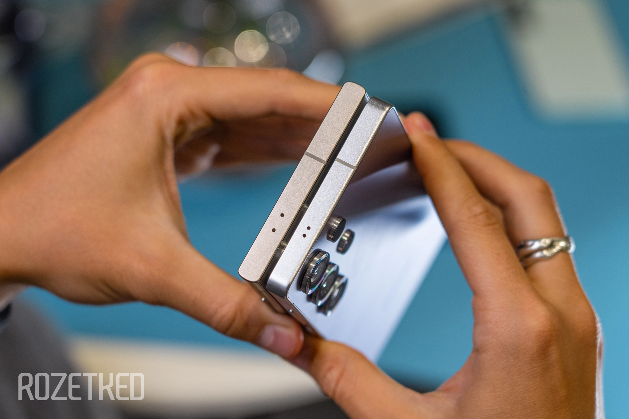 Блок камер оформлен в фирменном стиле Samsung: три крупных и два маленьких модуля заметно выступают над корпусом. Выглядит оригинально — китайские бренды не решаются копировать. Но вот зазор между модулями и корпусом всё же остался: туда неизбежно будет забиваться пыль, хотя проблема решается струёй воды из-под крана — благо, влагозащита IP68 позволяет.