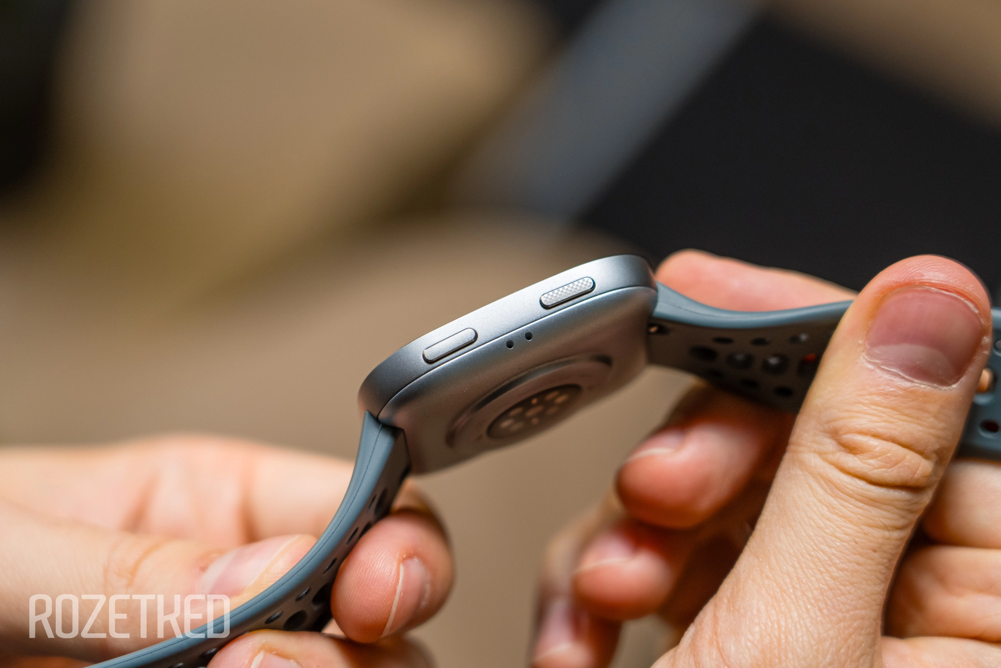 Справа расположены две клавиши. Верхняя запускает главное меню и будит экран. Нижняя отвечает за активацию режима тренировок. Обе кнопки крупные, удобные и чётко срабатывают без ошибок.